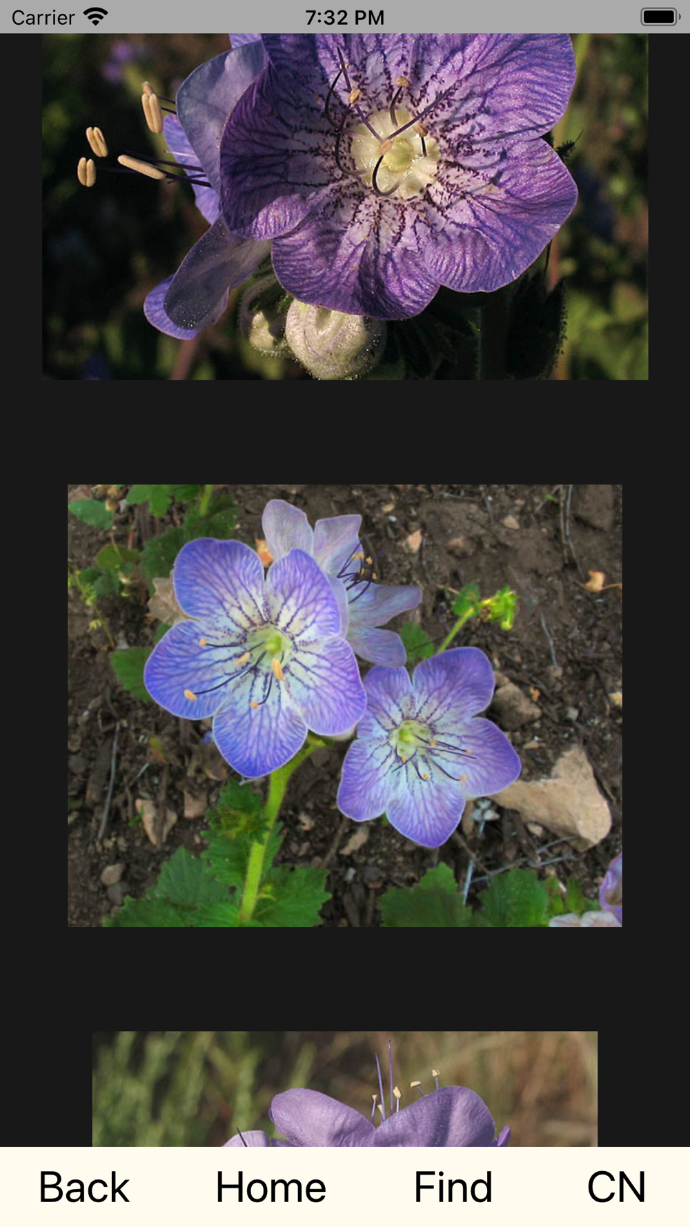 The App resides entirely on your iPhone, iPod Touch, or iPad, so the content generally loads much more quickly than even the highest connection speed can allow. However, the most significant benefit of the app is that if you are out in remote place without an Internet connection you can still access all of the App’s content. One consideration when downloading the App is that it takes up about 320MB (0.32GB) of the device’s internal storage due to the high number and resolution of the flower photographs.