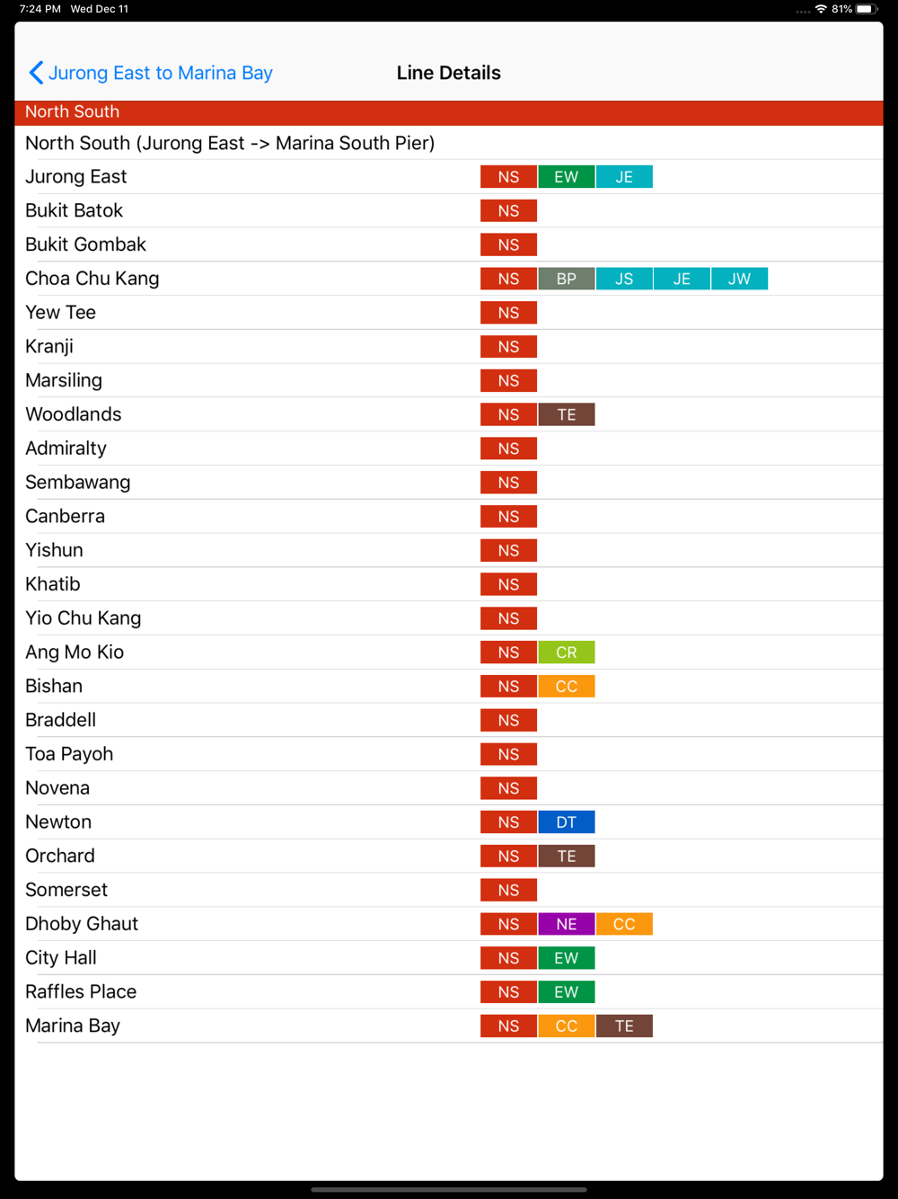 You can also view the detailed station list for each train line in Singapore. Also, you can long press on any station name from the list to see it on a map.