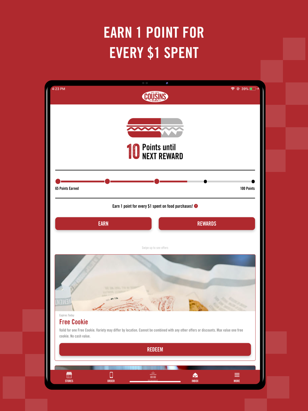 Rewards you can taste in every bite! Download the free Cousins Subs app to start earning rewards with every online or in-store purchase. Earn 100 points and your next 7.5” sub or Sub in a Bowl is on us – plus there’s plenty of free food to unlock along the way. Find the nearest location, order through the app & unlock freebies. Welcome to the Cousins Club – learn more below!