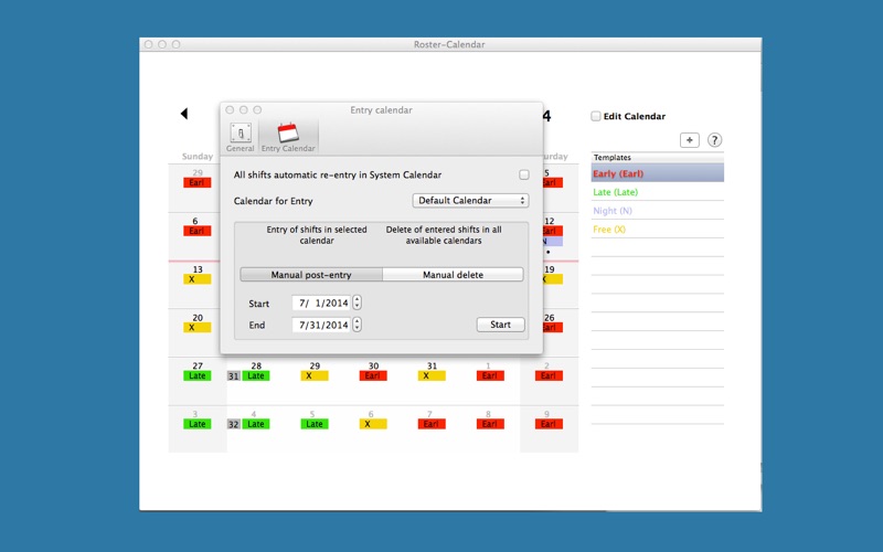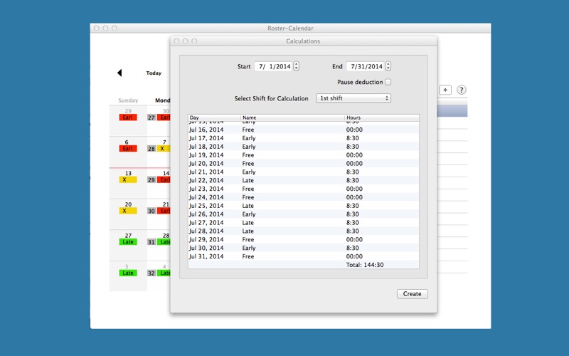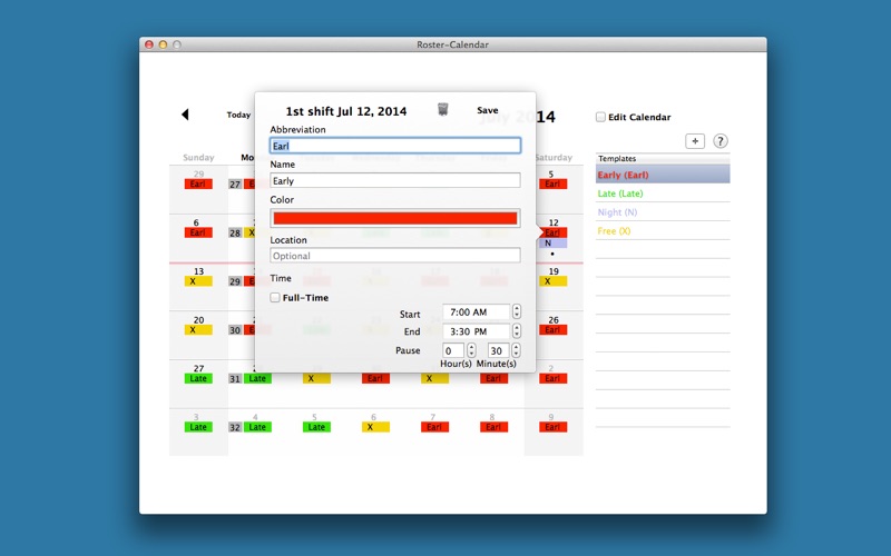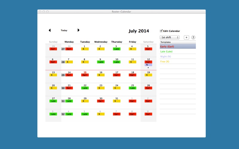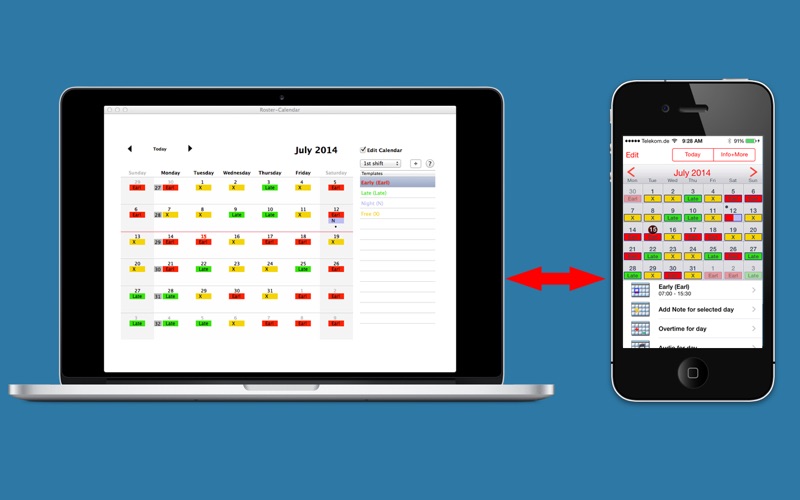 Quickly enter your shift patterns into your calendar. Just choose your shift, morning, regular or late and tap the corresponding day. You can define work times, colors, names and many more to fit your needs. With our unique app you can create your whole shift pattern in less than a minute. No app can beat this.