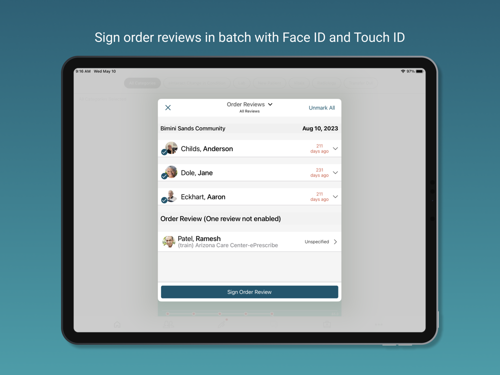 - Provide e-Signatures for telephone and verbal orders, sign once for multiple patients