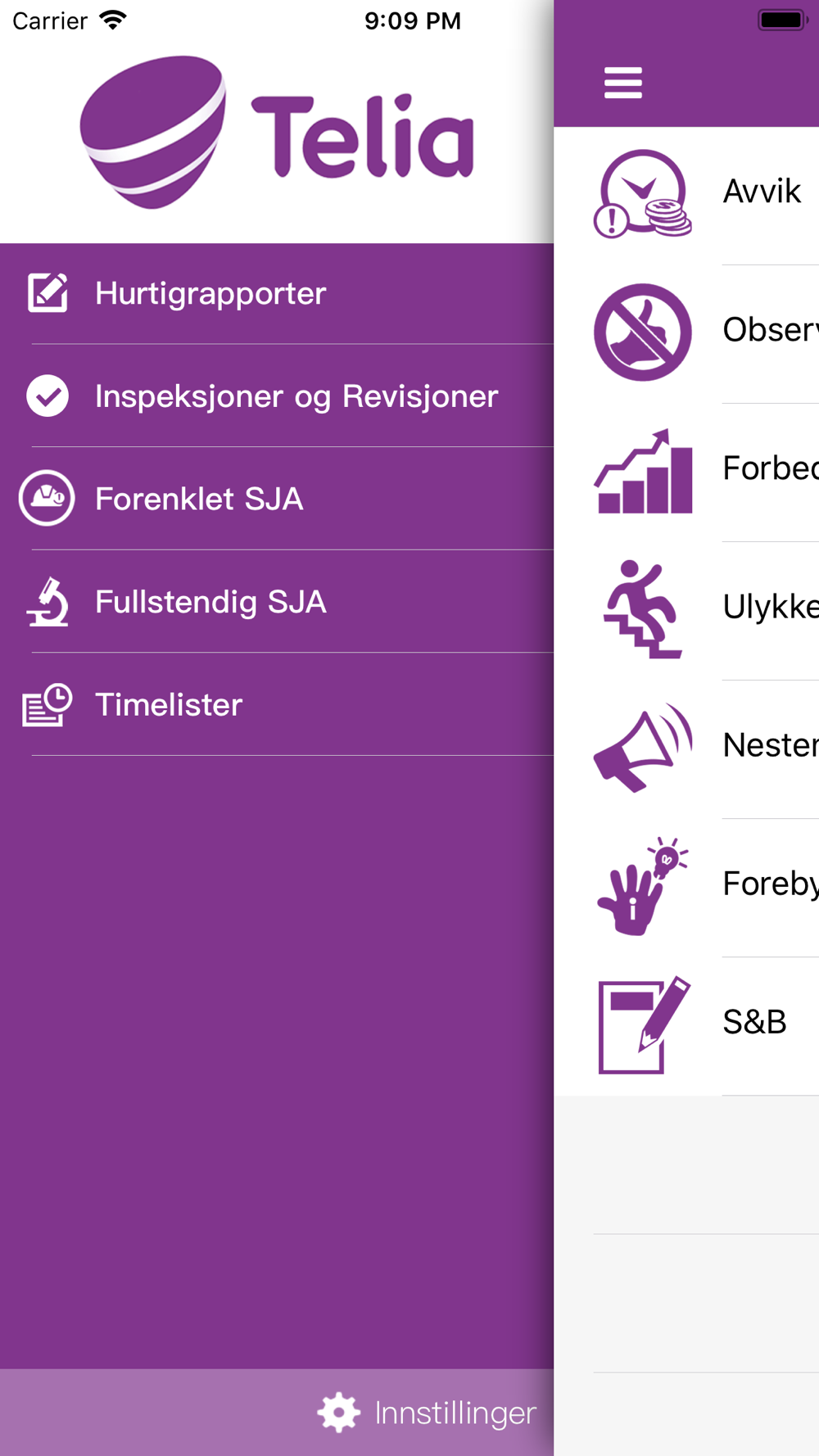 Dette er Telia AS' app til bruk ved innrapportering av HMS-hendelser og kvalitetsrelaterte saker. Appen inneholder systematikk for å sende melding om avvik, observasjoner, nestenulykker, ulykker og forbedringsforslag, samt en egen modul for dokumentasjon av gjennomførte sikker-jobb analyser / risikoanalyser og en annen for inspeksjoner og revisjoner.