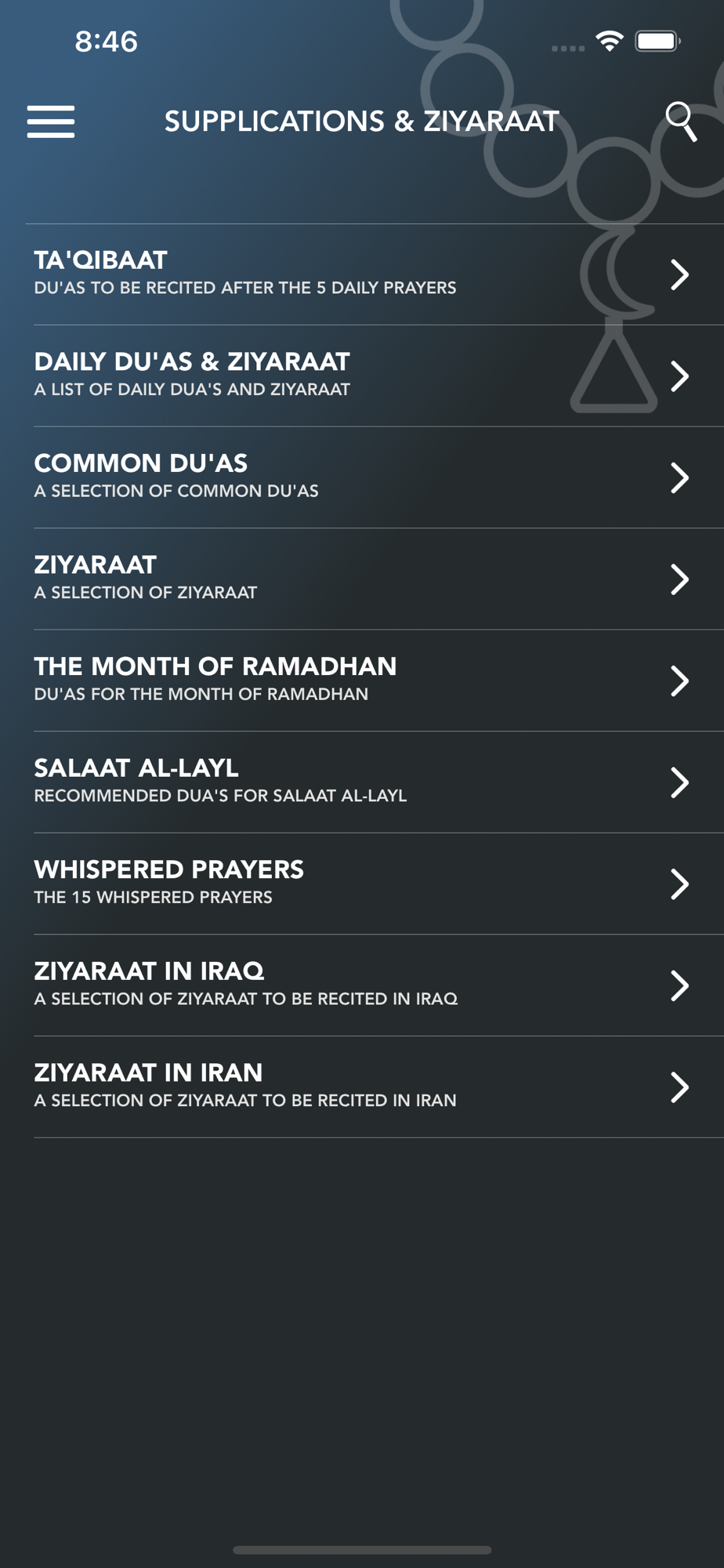 DISCLAIMER: Most of the English translations of Prayers, Supplications & Ziyaraat in this app have been taken from already existent sources and therefore their accuracy is as per their translation guidelines. We continue to update the text both in Arabic and English. Please do send us any corrections of requests.