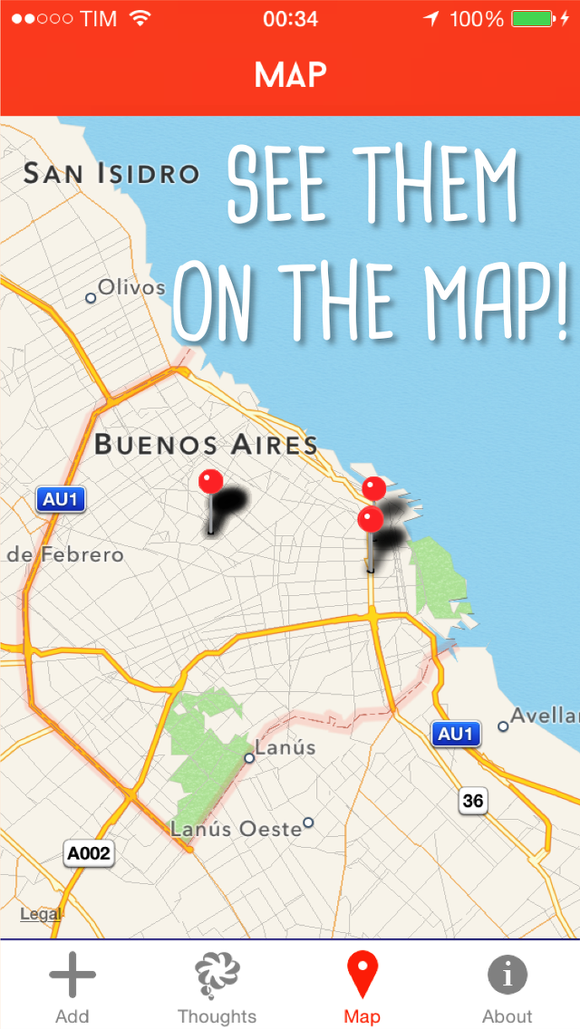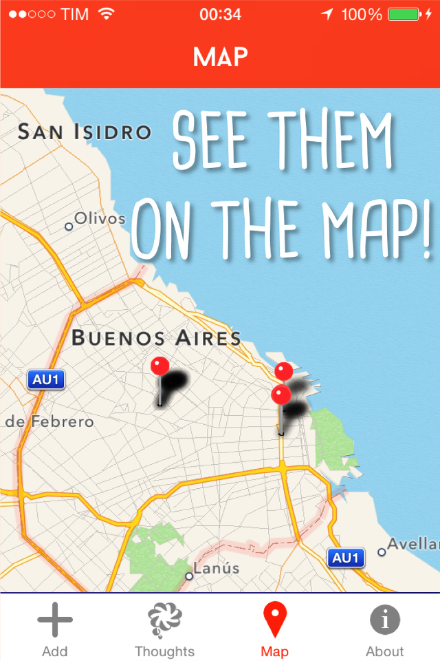 Explore the list of your thoughts, visualize where in the world have you added each one of them, and share them with your friends through the social networks!