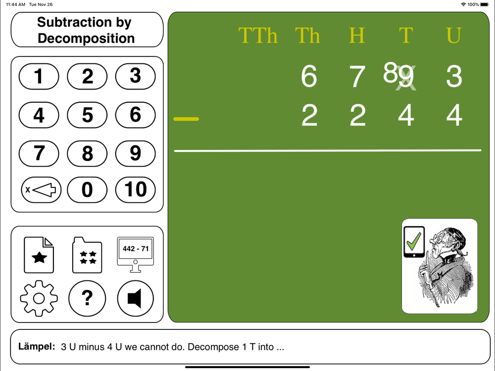 This educational app supports primary school children (usually from 3rd grade) to practise their multi-column subtraction skills.
