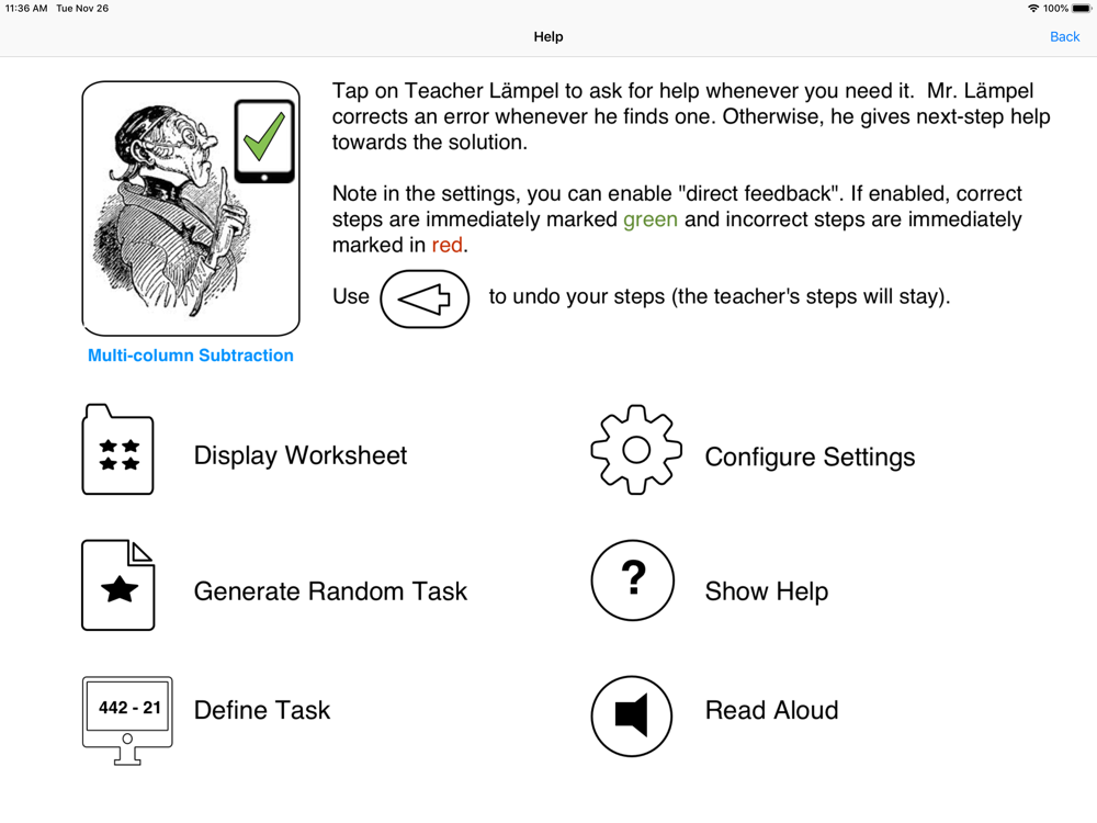 Pupils can ask Lehrer Lämpel for help at any time. Help first removes an erroneously learner step; if there are no errors, a single step is performed towards the solution.