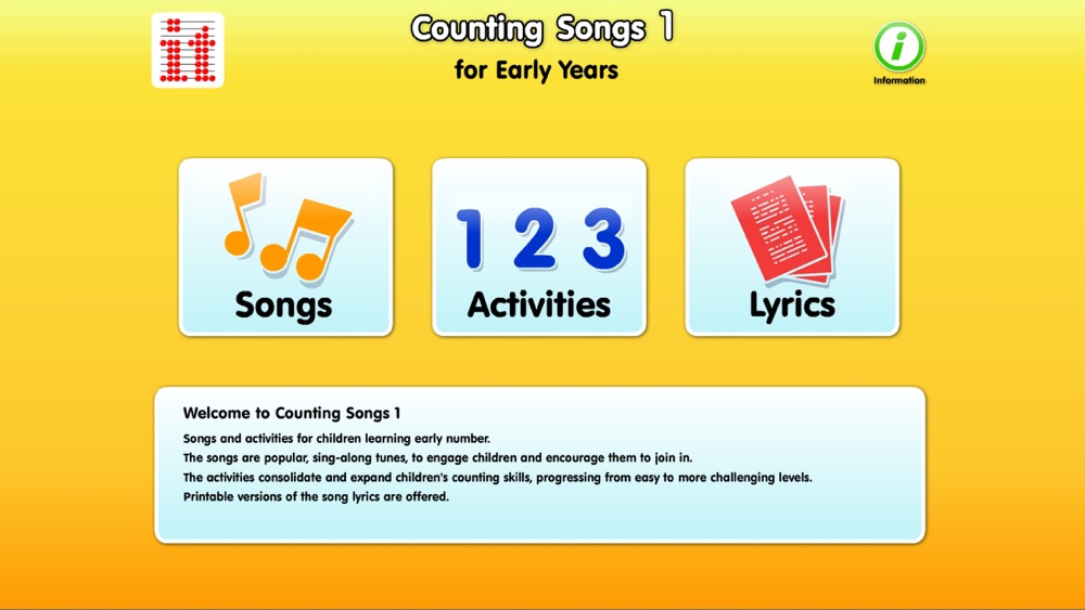 Counting Songs 1 offers stimulating cause and effect learning activities that engage and encourage early listening and language skills. Children can also learn about numbers from zero to five whilst counting along with the music and high quality voice over.