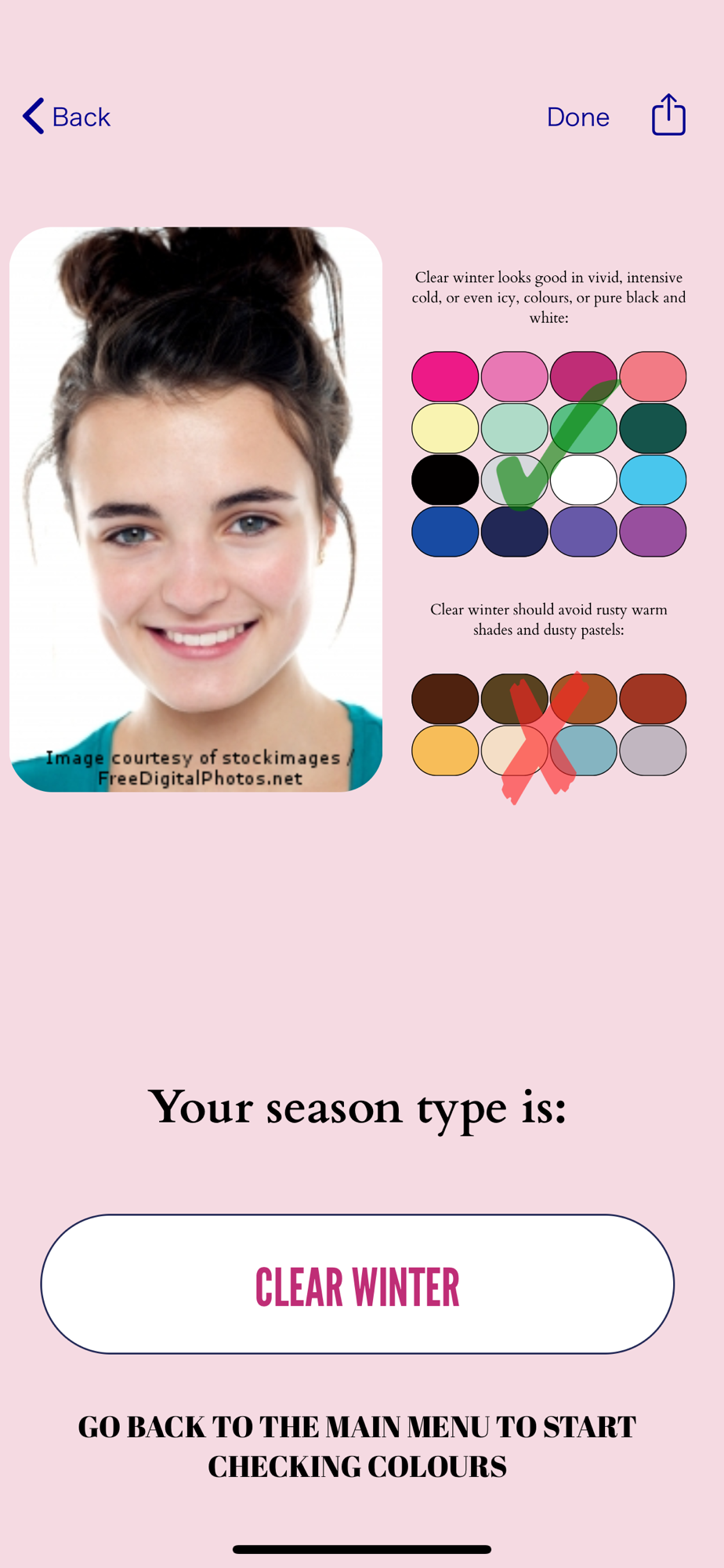 A note of caution: the colour type determined by the app is quite sensitive to the light conditions. The tone of the colour of your skin, your hair, etc. changes depending on the intensity and the temperature of the light. Please do not expect 100% consistency between the result you get in full sunshine, or on a cloudy, rainy dull day. Ideally, take photos in full daylight, avoiding direct sunshine. Also see how your colour type can be affected by different lighting conditions - perhaps in the evening, in artificial, you look better in a different choice of colours than at daylight?