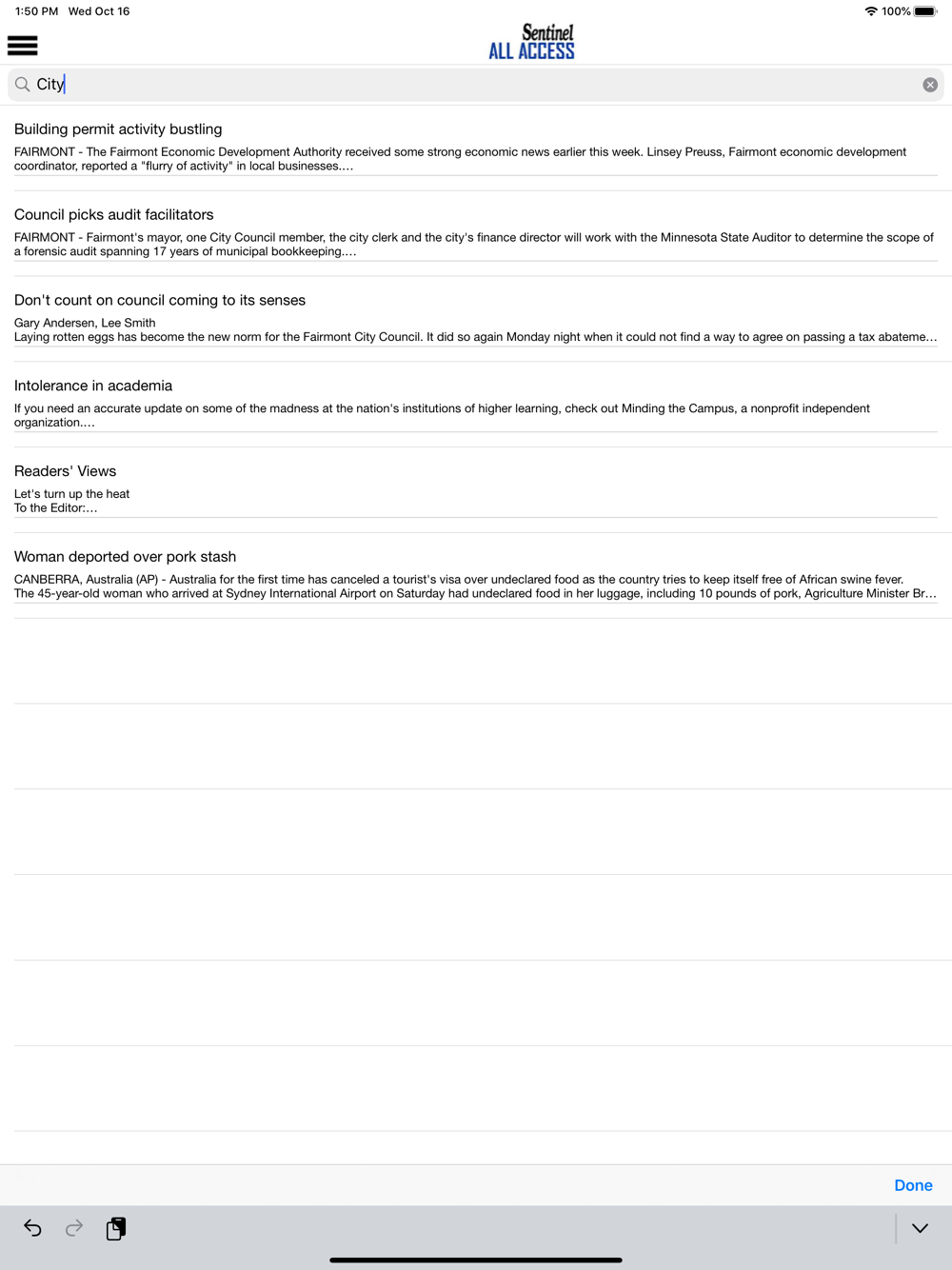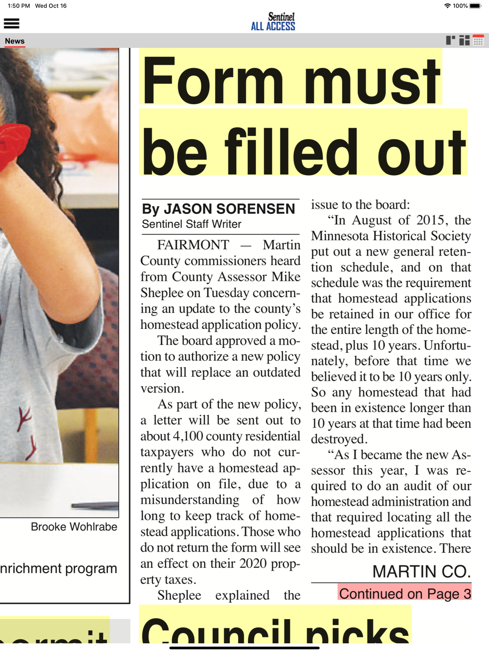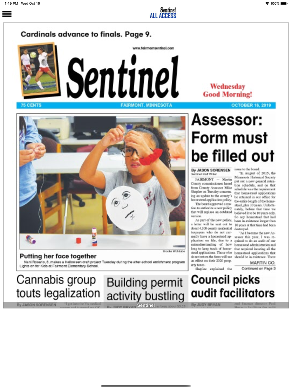 Stay on top of news from Fairmont and surrounding areas by receiving the full print version of the Sentinel on your iPhone or iPad. Every page of every edition is delivered to your device. The Sentinel is the best source for local and national news, sports, weather and features in Fairmont, South-Central Minnesota, the Minnesota River Valley and Northern Iowa. Download the app to view the printed pages of the newspaper or read headlines and stories along with related photos in a built-in story viewer.