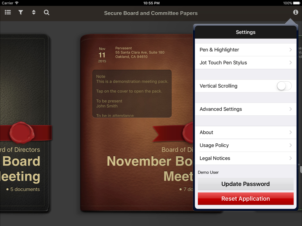 Your directors simply enter their credentials and their board documents are downloaded to their iPad. Older documents are automatically removed. No extra steps required. Other features include: