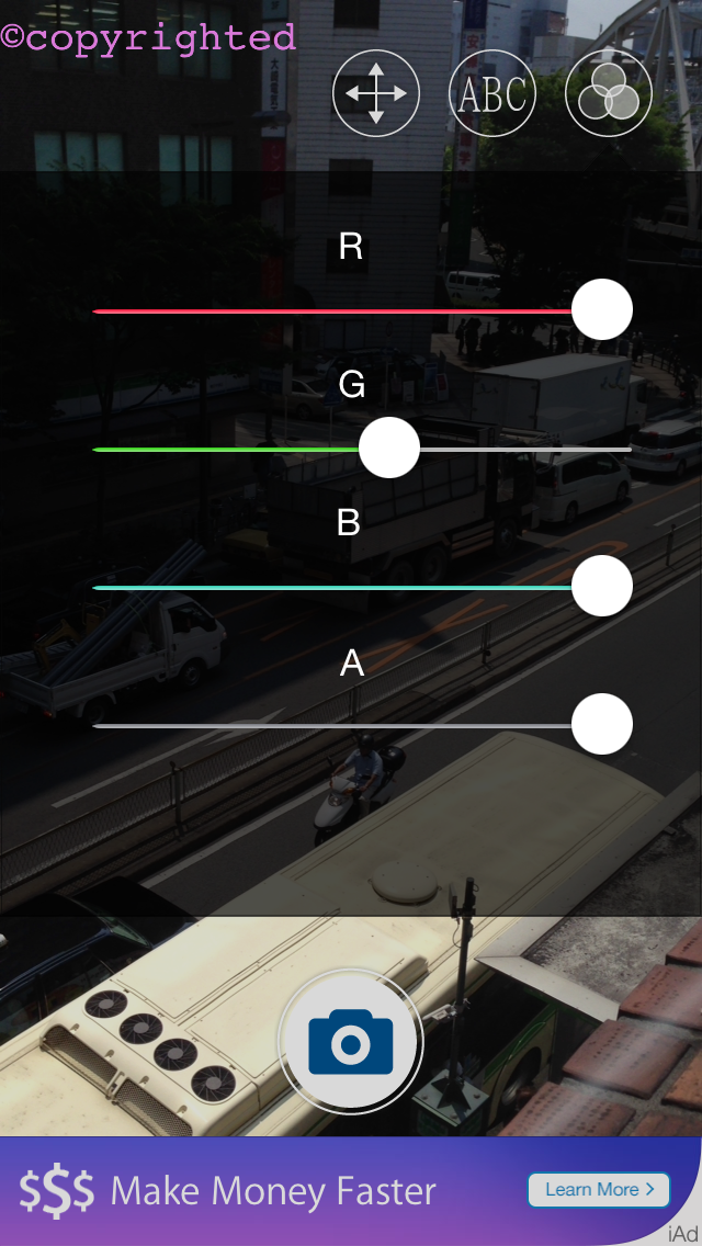 この「Copyrighted」は、カメラで撮影すると同時に「著作権表示=コピーライト」を挿入するシンプルなアプリです。