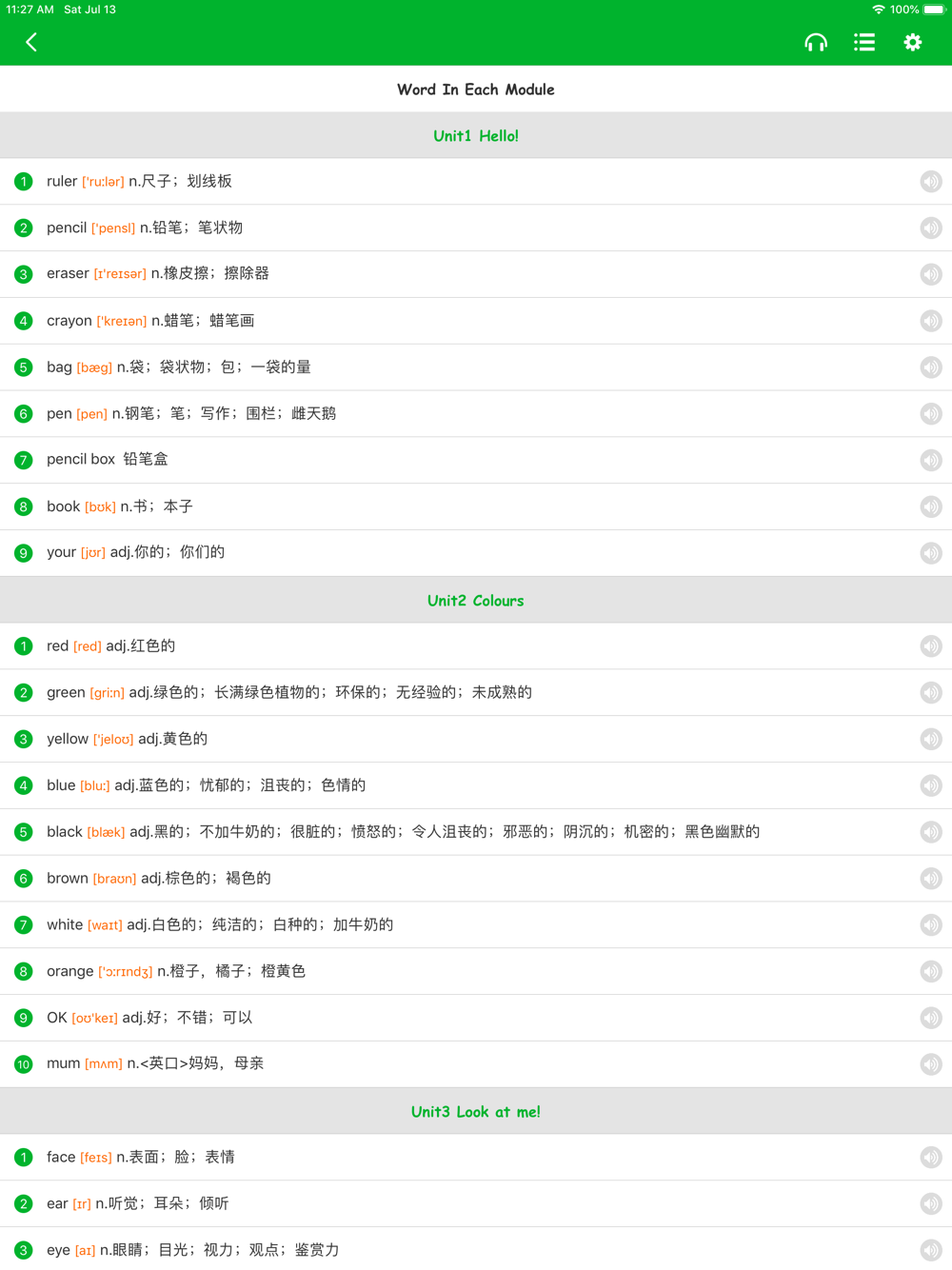 因本APP全部采用标准美式发音,故附录中的单词音标注解均修改为美式音标注解,与课本的英式音标注解不同,请各位家长在引导孩子学习时注意区分