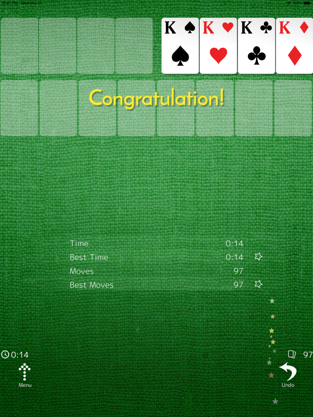 The purpose is sent all cards to the space called "home cell". Card can be overlapped the red and black alternately. You can move only one card at a time. On the "free cell", you can put anything. When you failed, it's able to undo anytime.