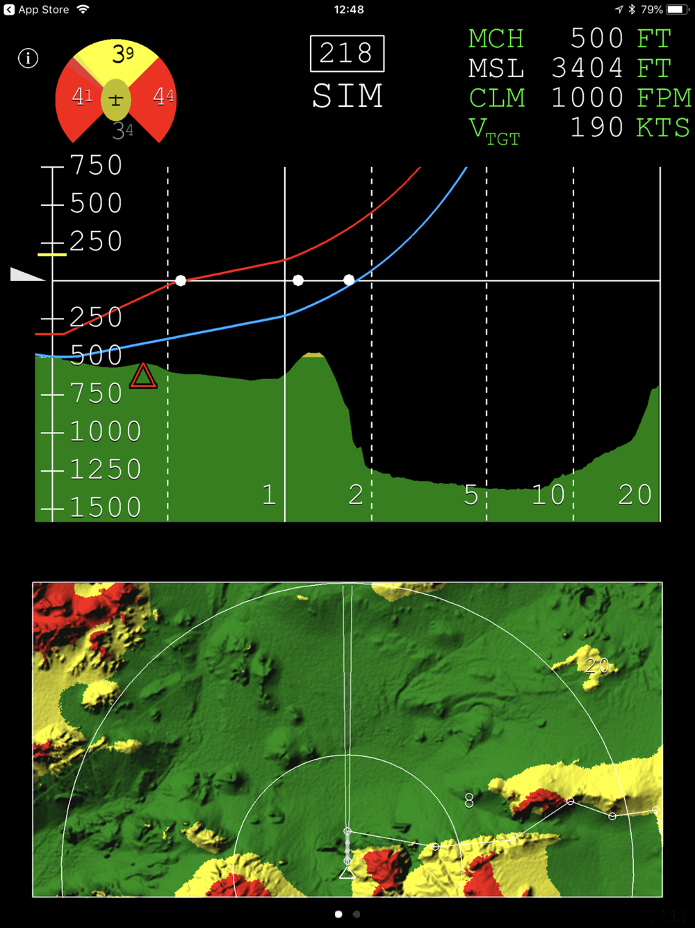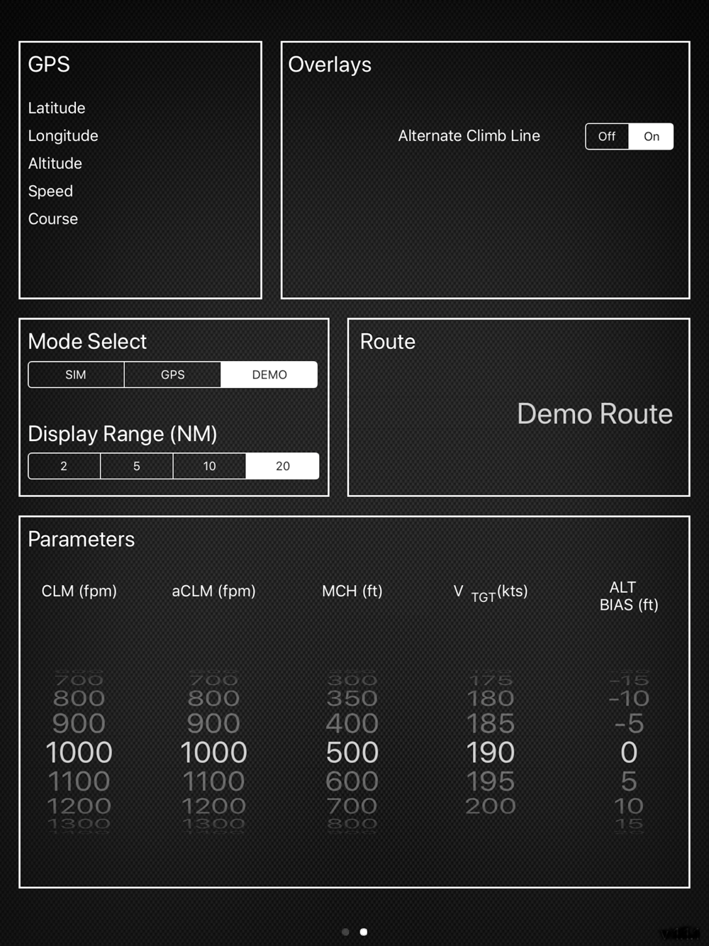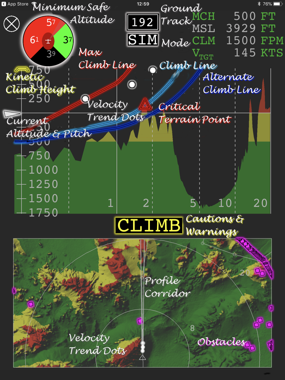 VerSA™ provides pilots with situational awareness to avoid Controlled Flight Into Terrain (CFIT) accidents. The display contains a moving map and terrain profile view with colored altitude banding based on the aircraft altitude and user selected Minimum Clearance Height. Based on user selected climb capability for the aircraft type, information is displayed about the aircraft energy (maximum and targeted climb rates and vertical flight trend) on the profile view. It is either standalone using the internal iPad GPS, or may be used with an external GPS.