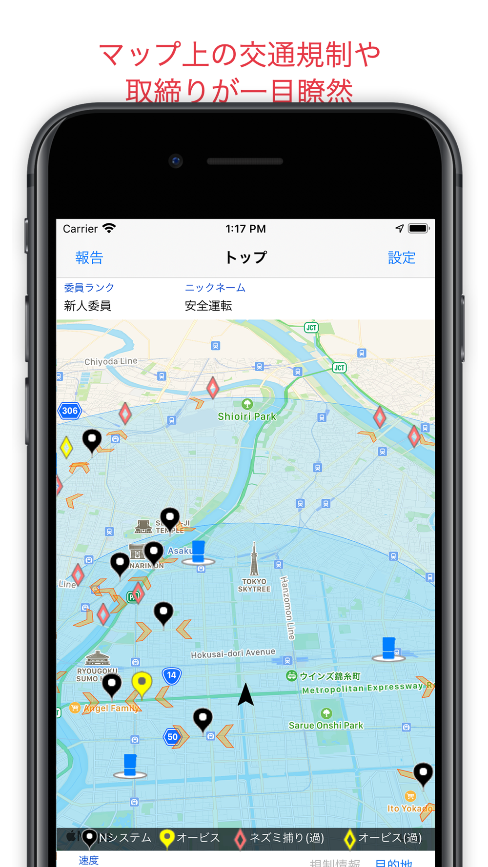 交通取り締まりを探知した際はトップ画面下の地図中に取締りの種別毎に色分けされたマーカーにより表示され、更に音声とにて通知します。