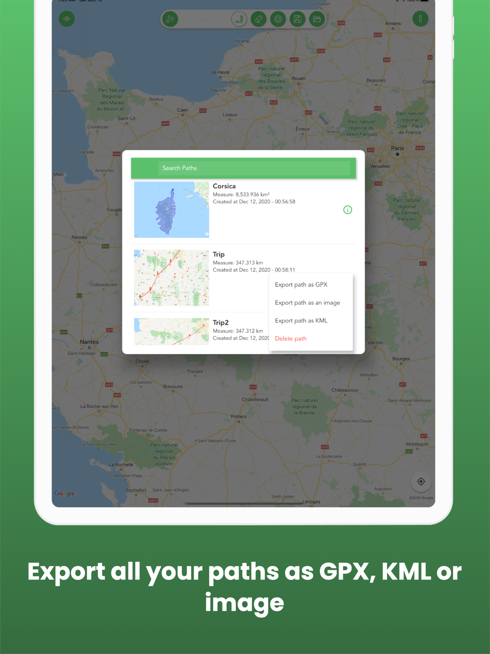 When you are ok with your drawing, simply save it with a name to use it later. All saved drawings can be exported to GPX or KML file and shared with your contacts. You can even see the image generated by the path without the need of an internet connection.
