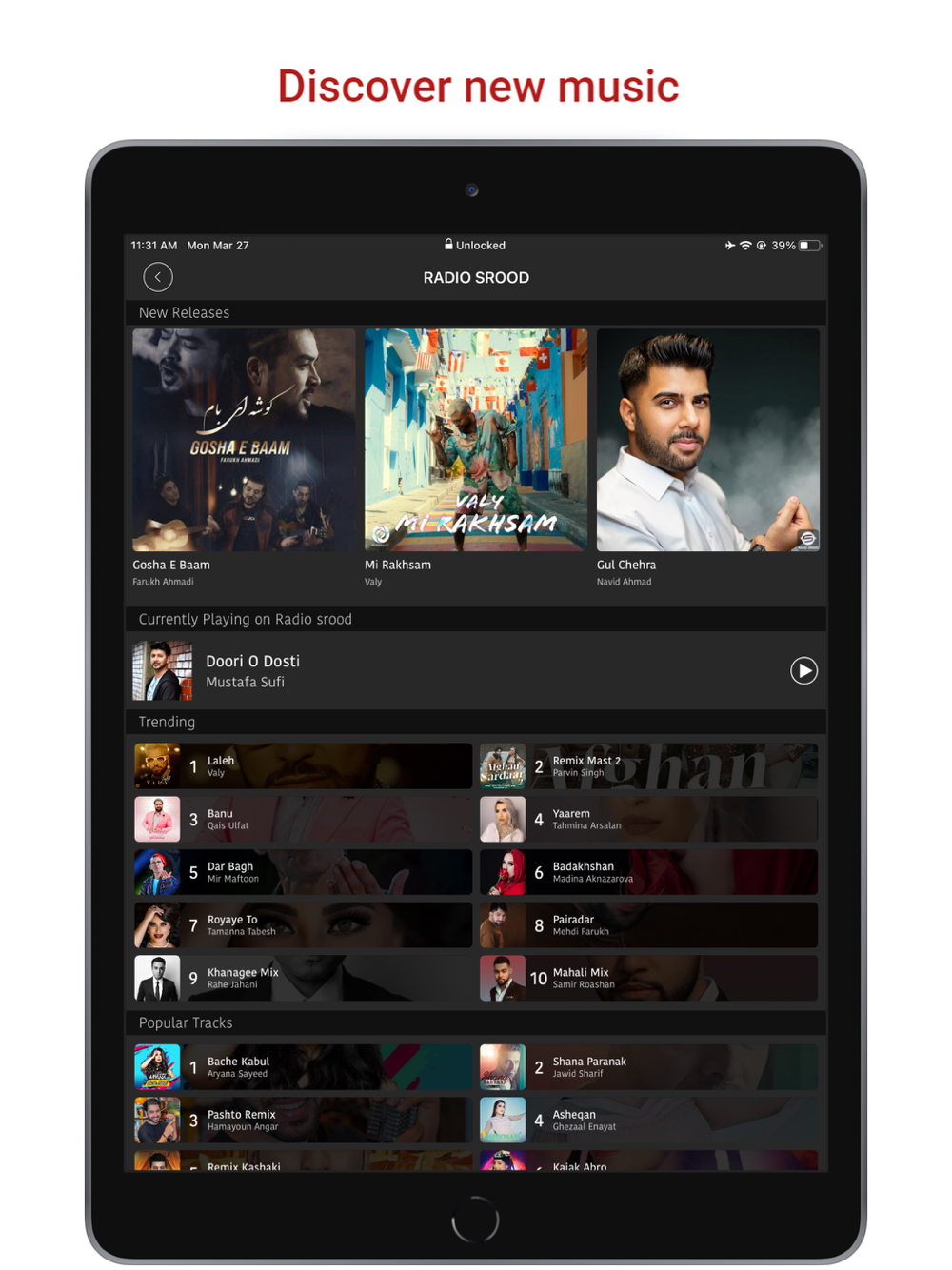 Radio Srood is an Afghan music app, you can play and listen to latest Afghan music with high quality sound on your phone. Download our free iOS app and discover latest Afghan music, albums, mixes, playlists, online radio, and much more, all in Radio Srood app!