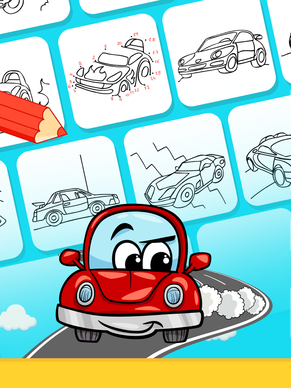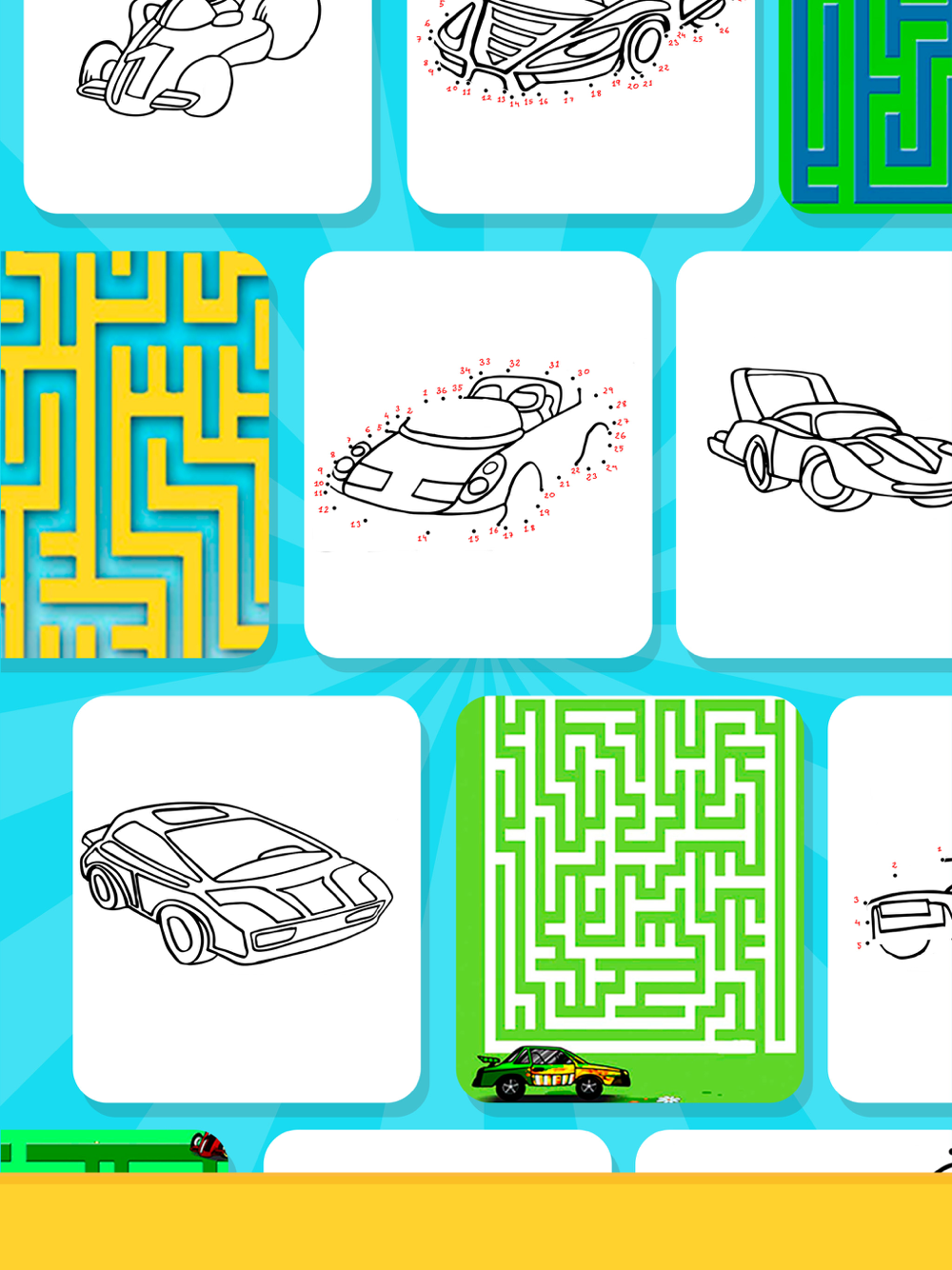 Enjoy the coloring pages of cars with different games. Discover these amazing drawings of racing cars, trucks, police car, fire truck or other vehicles! Learn about many types of vehicles such as monster trucks, tractors, rally cars and many more. Play puzzles, maze games to find the way out and exit the labyrinth. Spend fun time with connect the dots or numbers games, and paint the best drawings of your favorite vehicles.
