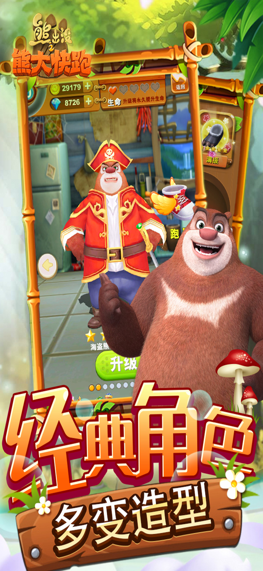 惊险刺激的冒险怎能少了宠物的陪伴,风翼白虎、福运青龙、机械熊猫、飞天小哈…每个宠物都有自己特殊的技能,让你在冒险中如虎添翼,达成解锁条件即可免费拥有,赶紧把这些可爱迷人的小宝贝领回家吧。游戏中还可以给熊大熊二随意换装哦,头戴骷髅帽的船长熊大,手拿金箍棒的美熊王,翱翔太空的宇航熊,总有一款是你的菜。
