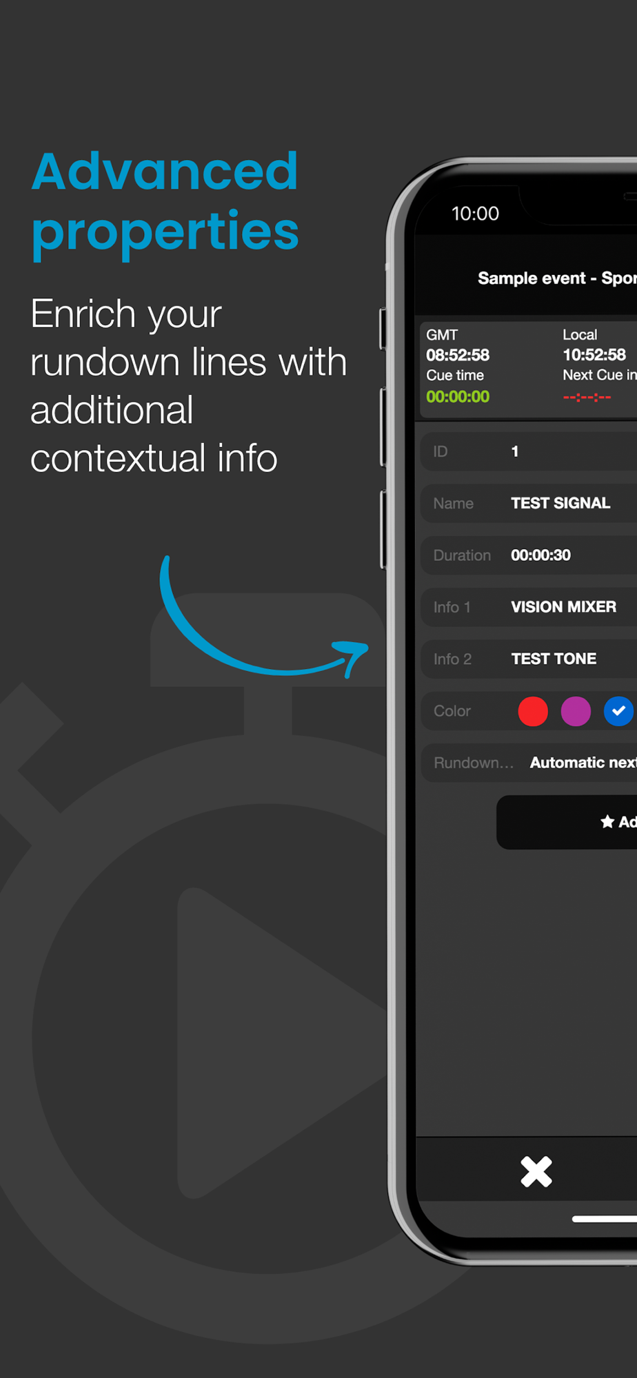 - Three Rundown modes: Automatic (ends automatically when reached duration) Manual (Sequence doesn’t change until you tap manual jump) and fixed time event (Jumps to Cue line when rundown time is reached).