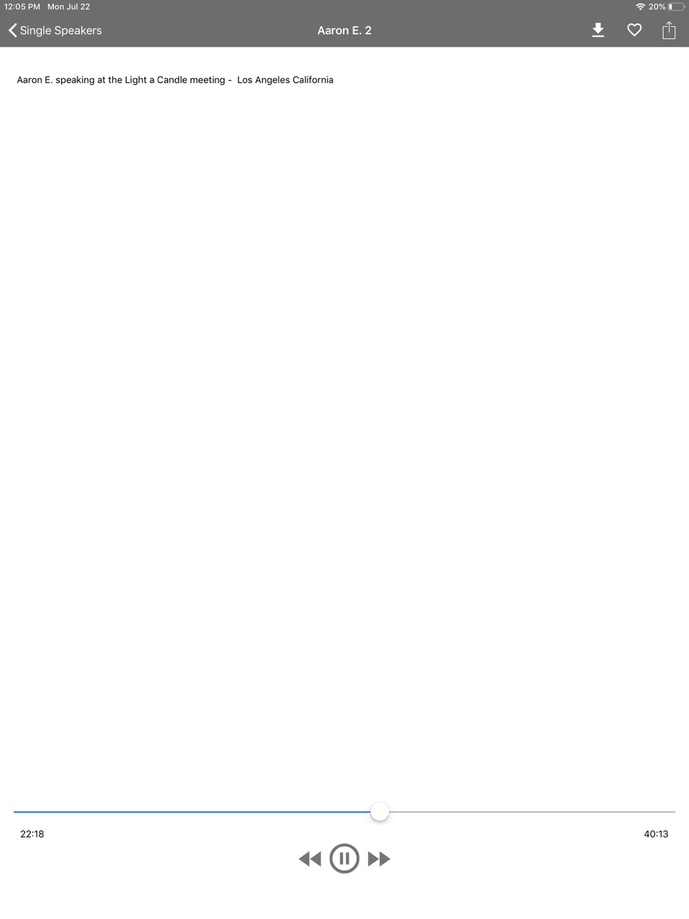 The OA speakers app allows you to listen to recovery speakers from Overeaters Anonymous (a 12 step program) whenever and wherever using simply a wifi or cellular network connection. The app includes 500+ speakers speaking at Overeaters Anonymous meetings and conventions worldwide with descriptions of where they are from and where they are speaking.