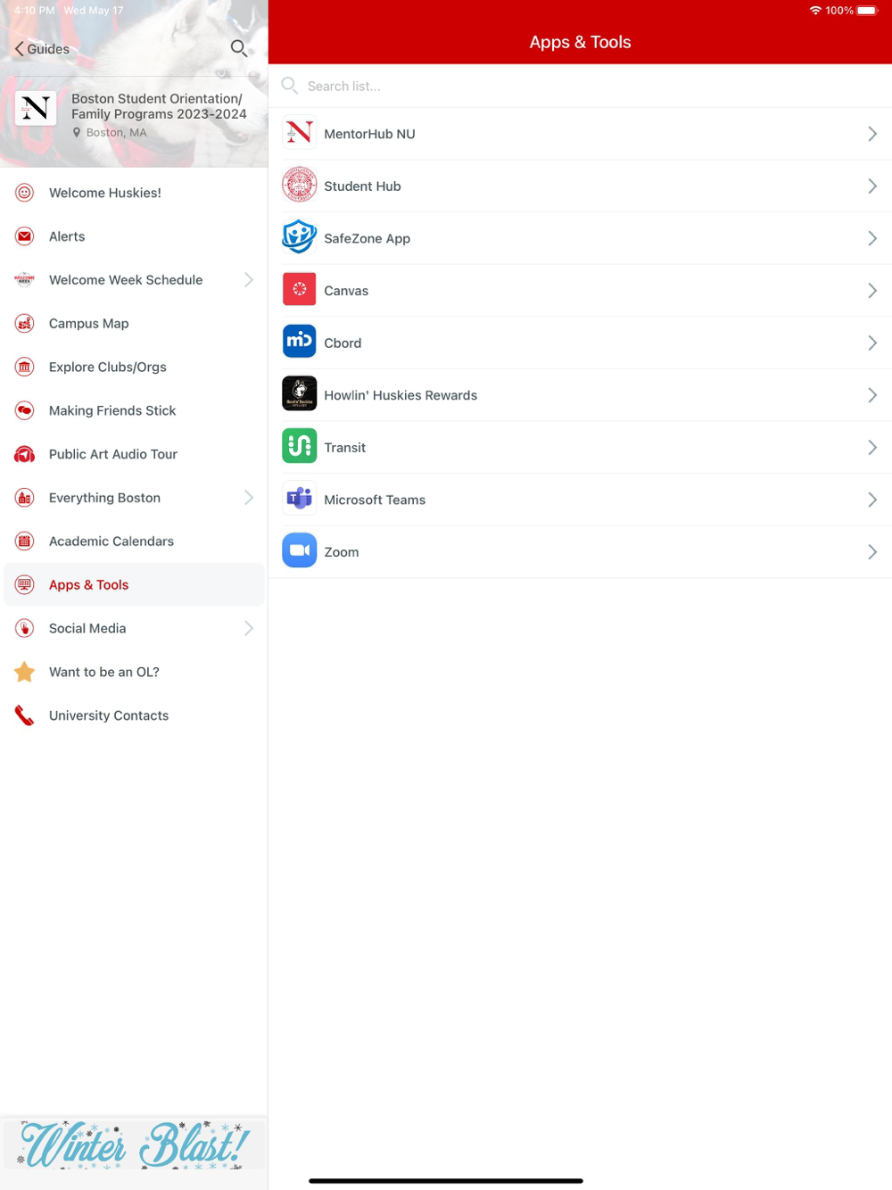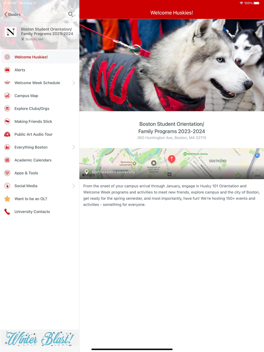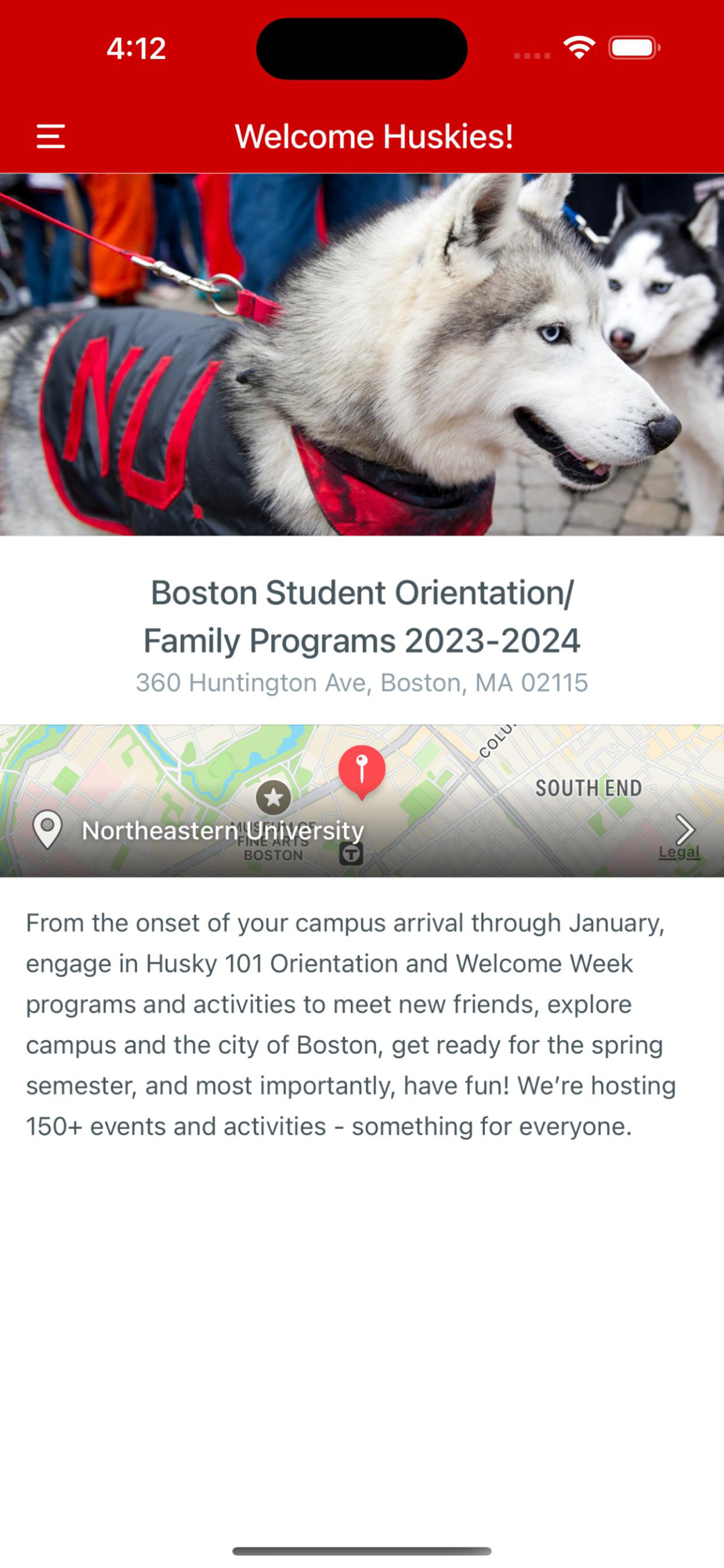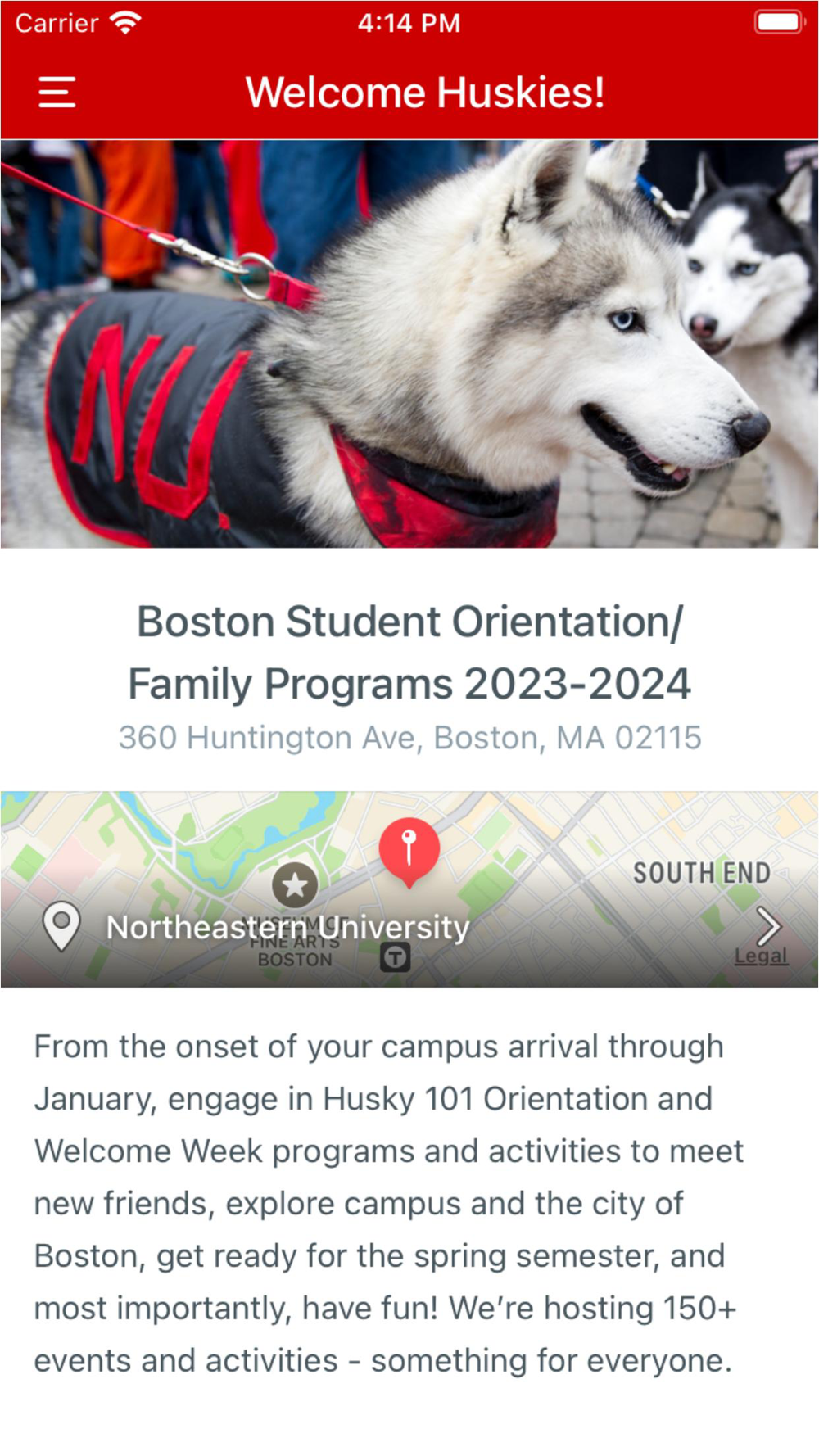 The Northeastern Student Orientation/Family Programs app is your guide to the new student and family transition onto the Boston campus. Access Student and Family Orientation, Welcome Week, and Family & Friends Weekend program schedules and resources.