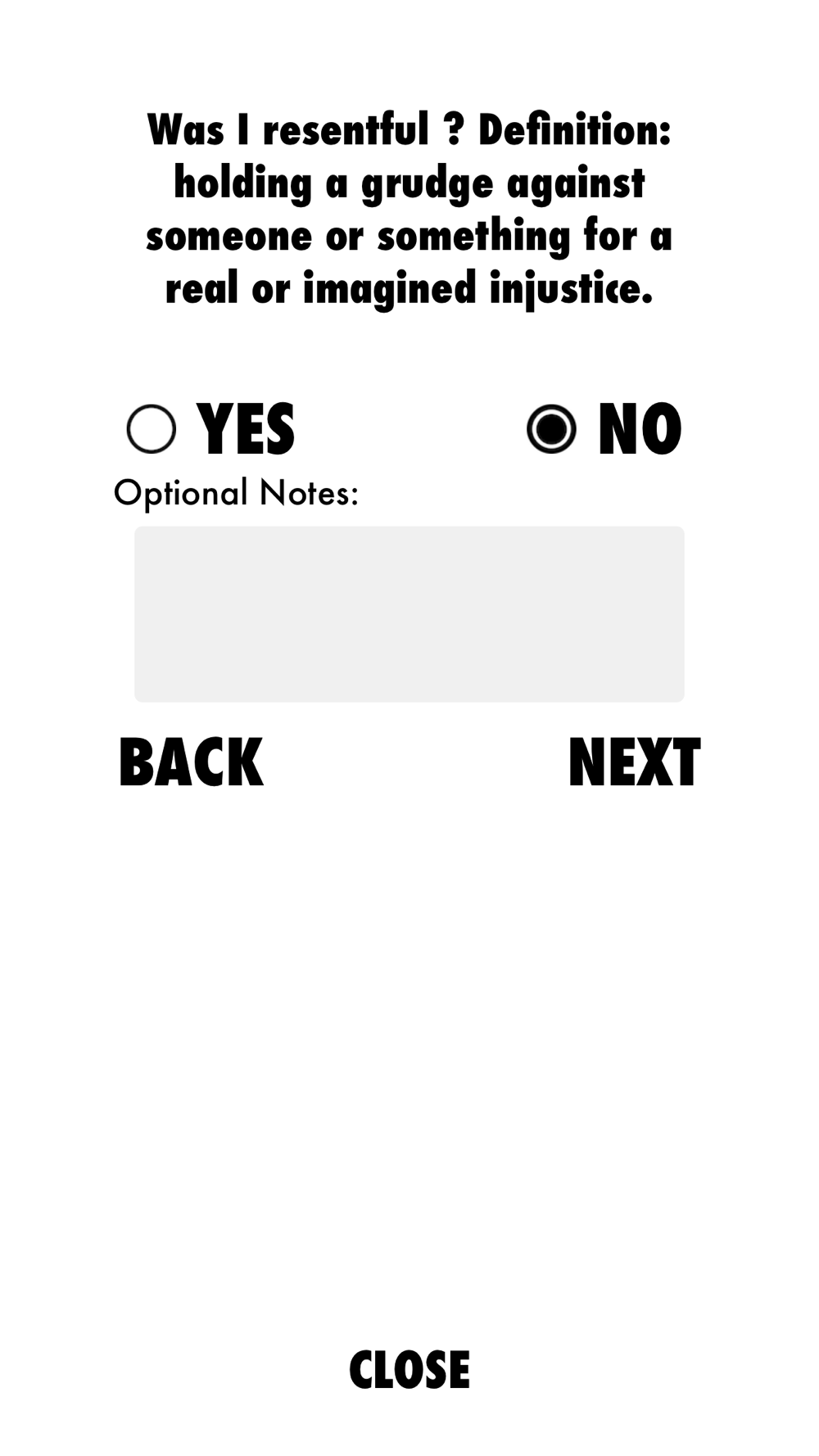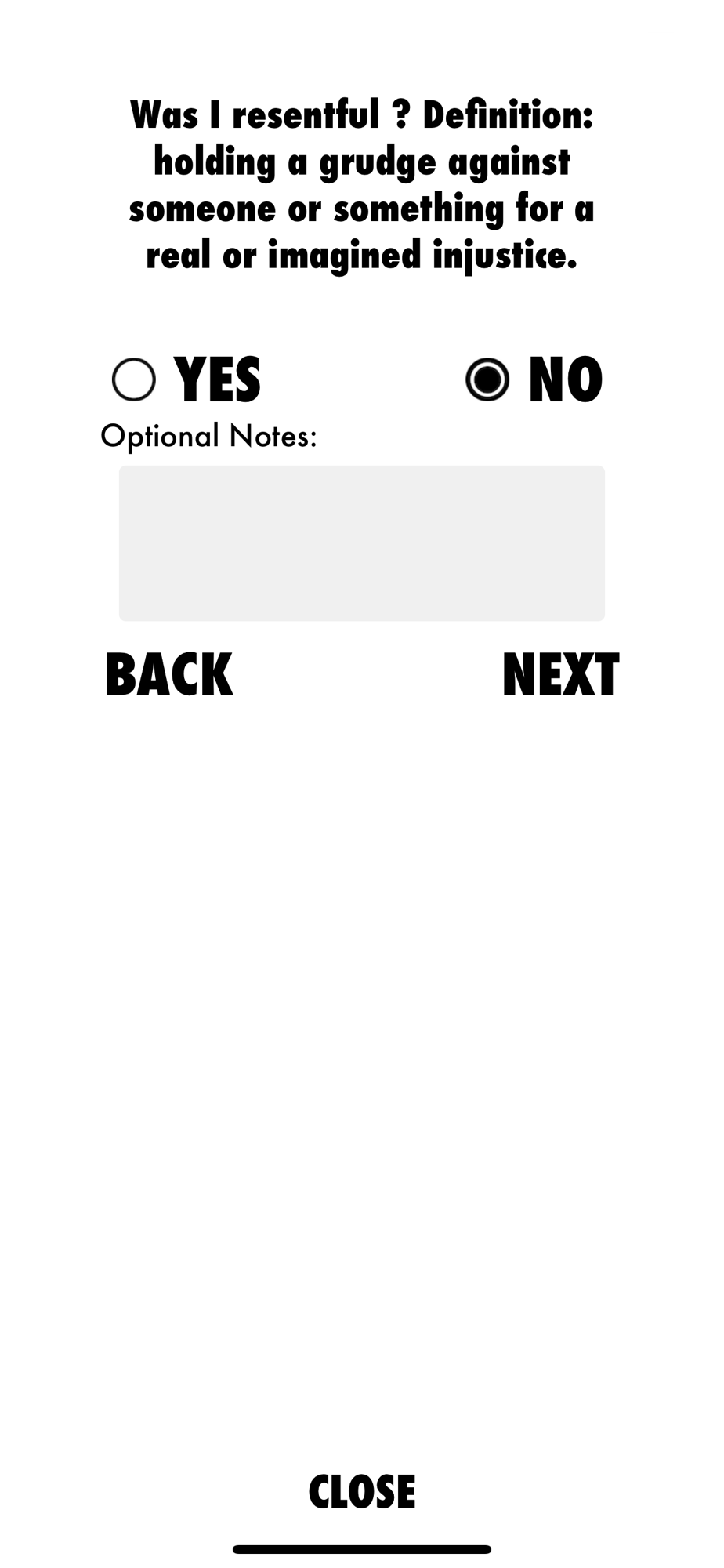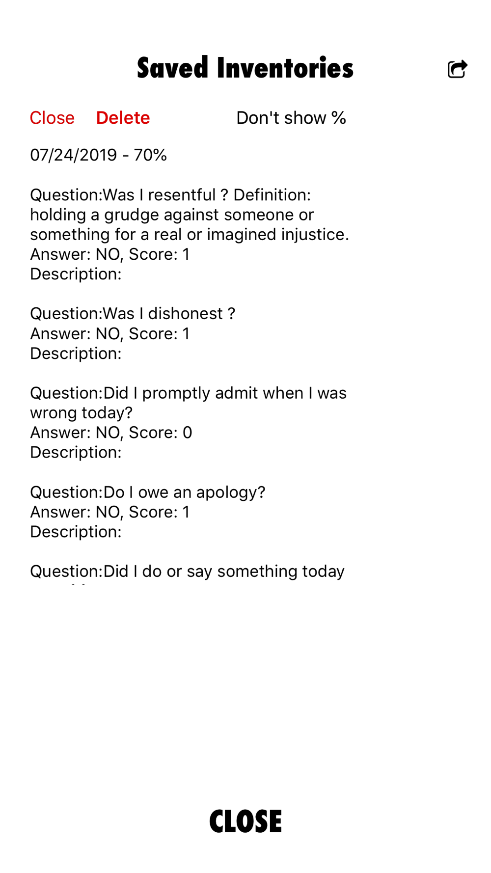 Tenth Step nightly inventory app that was created by members to help simplify their daily inventory. It doesn’t get easier than this. Reflect on ten yes or no questions at the end of your day to help you complete your 10th Step inventory. Inventories are saved and stored by date. Optional tool within the app lets you “track” how well you’re walking on the 12th Step beam over time, depending on how you answer each days questions.