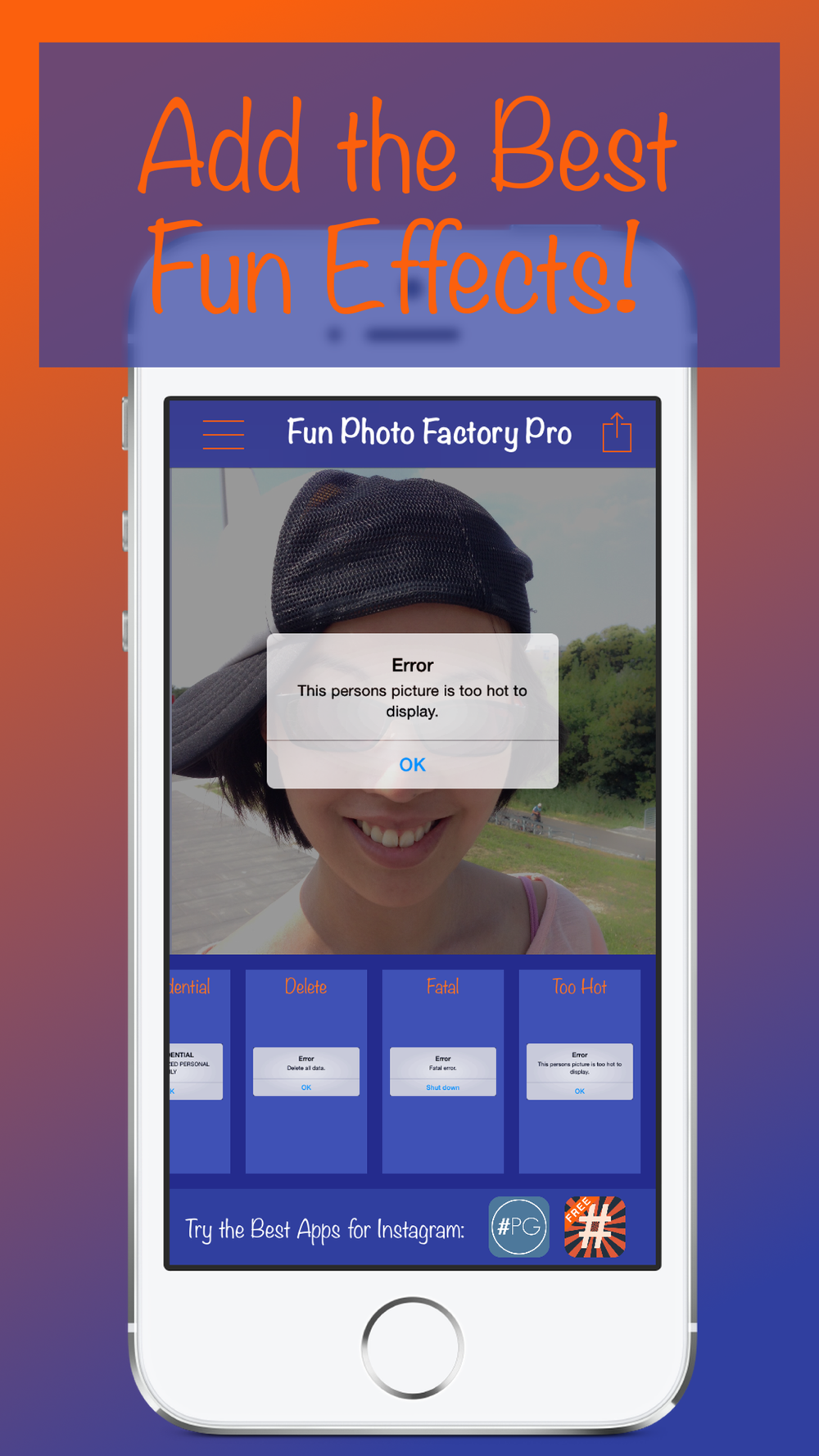 Fun Photo Factory Pro is packed full of fun effects: There are more than 100 effects from 10 different categories. For example, add a play button to your picture and send it to your friends. You should watch their faces, when they are trying to play it like a video!