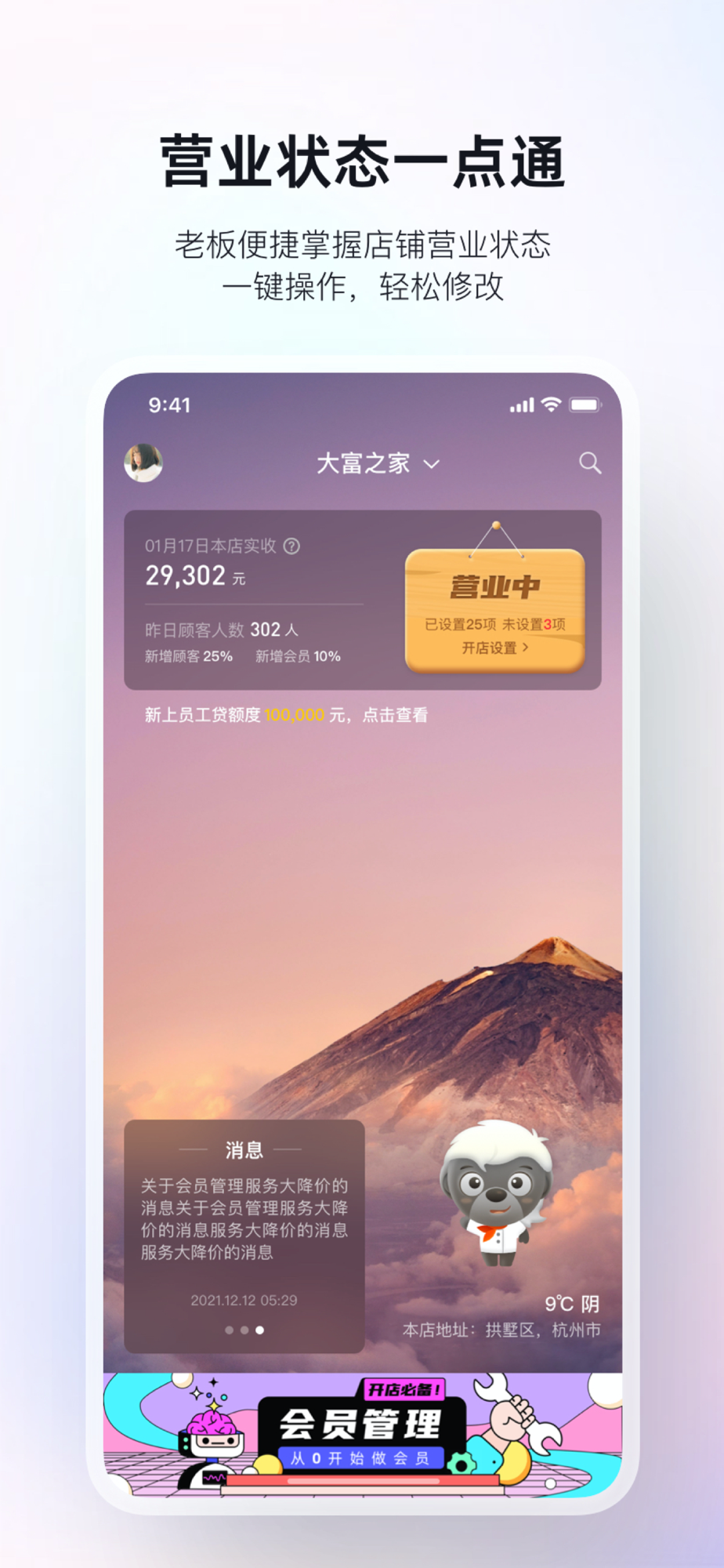功能介绍:无论在哪里,随时可以查阅餐厅运营数据,管理商品,设置桌位,发起针对会员的各种营销活动……让管理店铺变得方便灵活,降低人工成本,提高工作效率,是店铺管理者的利器。