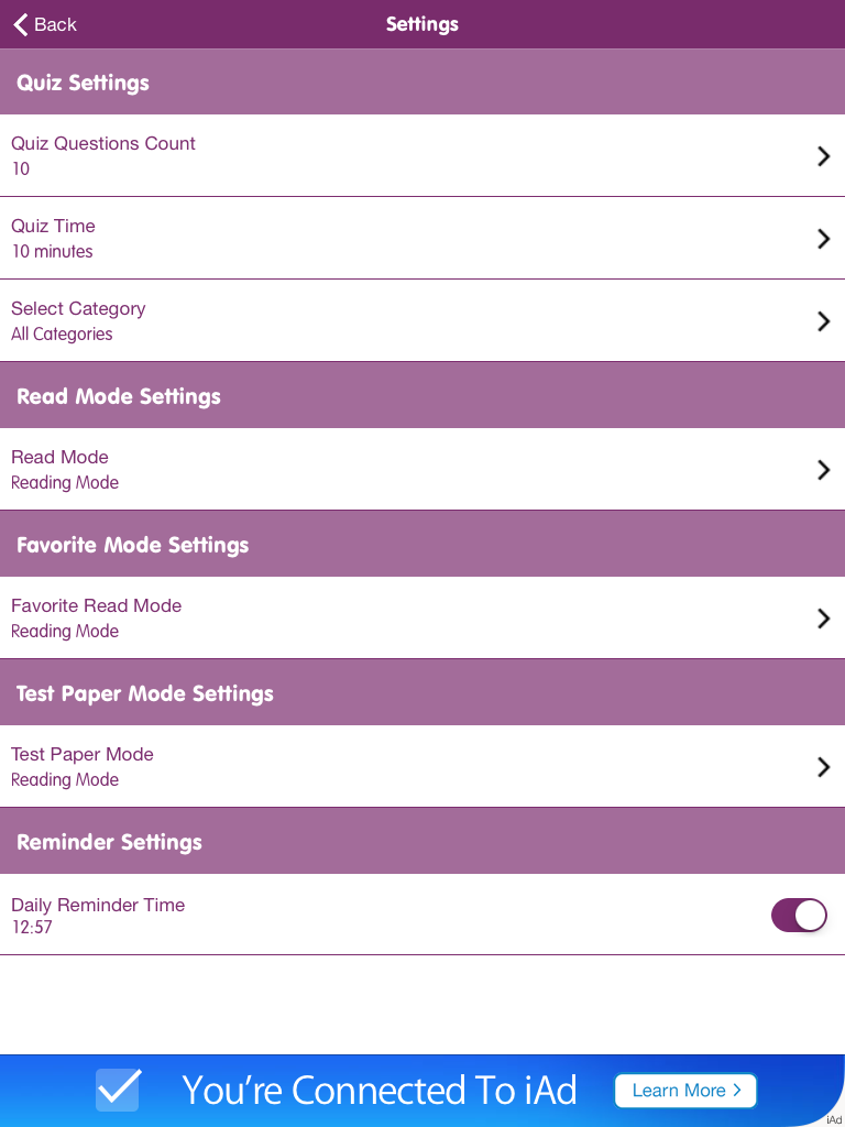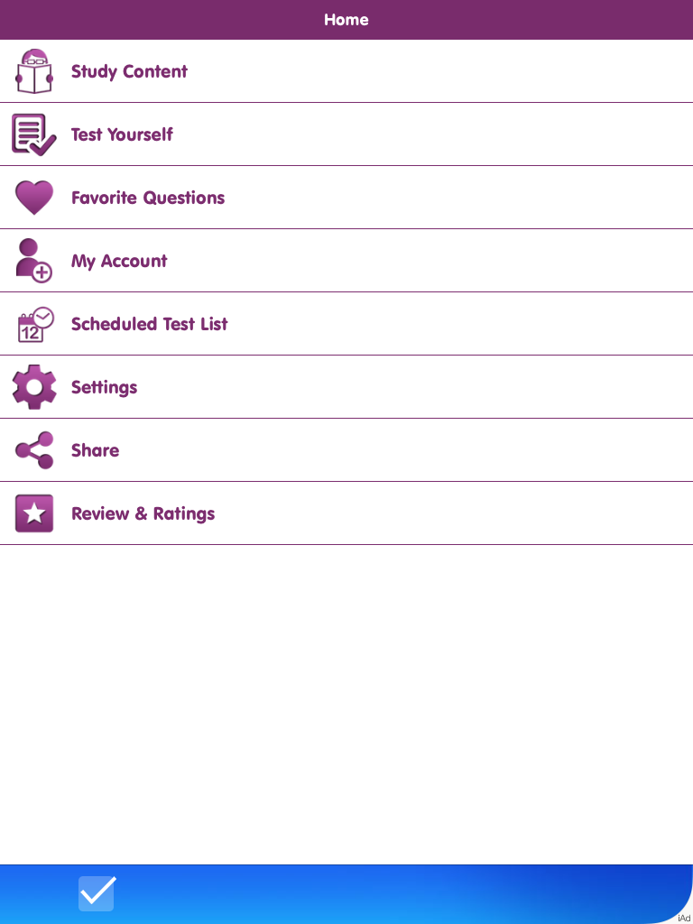 Show categories and subcategories. As per selection, display questions of that category. Questions can be viewed in test mode or reading mode. In test mode, user should select right answer and check for right or wrong. In reading mode, user will be shown right answer with the question. Questions can be marked as favorite.