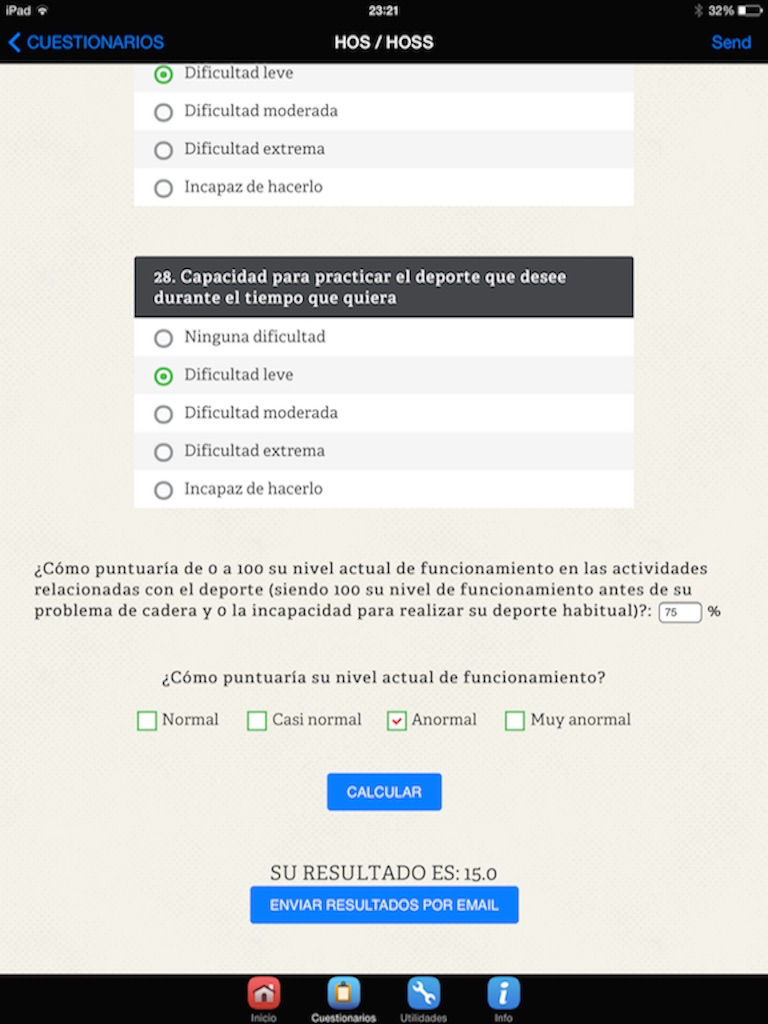 Los cuestionarios incluidos en la aplicación se pueden rellenar fácilmente por el paciente, y, una vez completados, la aplicación calcula el resultado final y éste puede ser guardado o enviado por email.