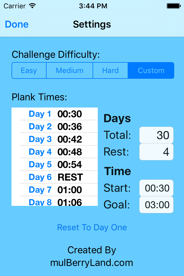 This Plank Challenge timer is designed to simplify multi-day fitness goals by automatically calculating incremental daily targets, and automatically setting the timer accordingly for each day of your challenge.