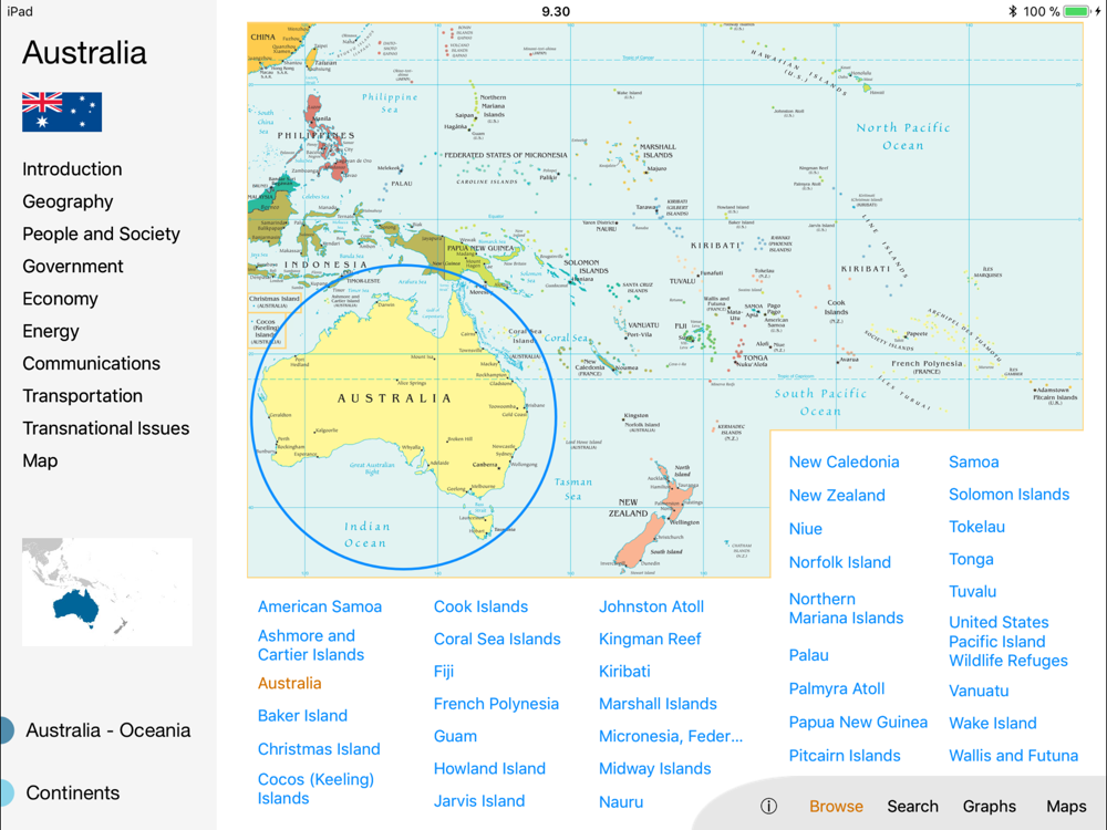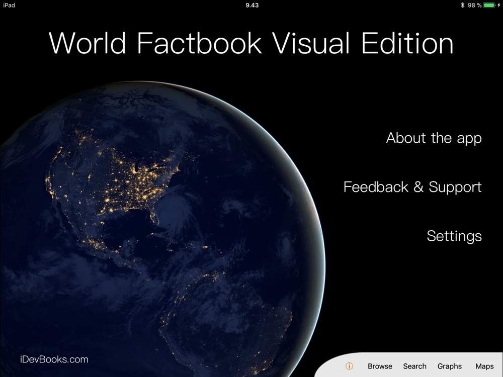 The app has browsing, search, graphs, and map sections. In the browse section the user can select countries by tapping maps, or by selecting from a list. The user can also search for countries in the search section. In the graphs section dozens of data comparisons are presented as visual graphs or beautiful colored world maps. The maps sections has a collection of maps.