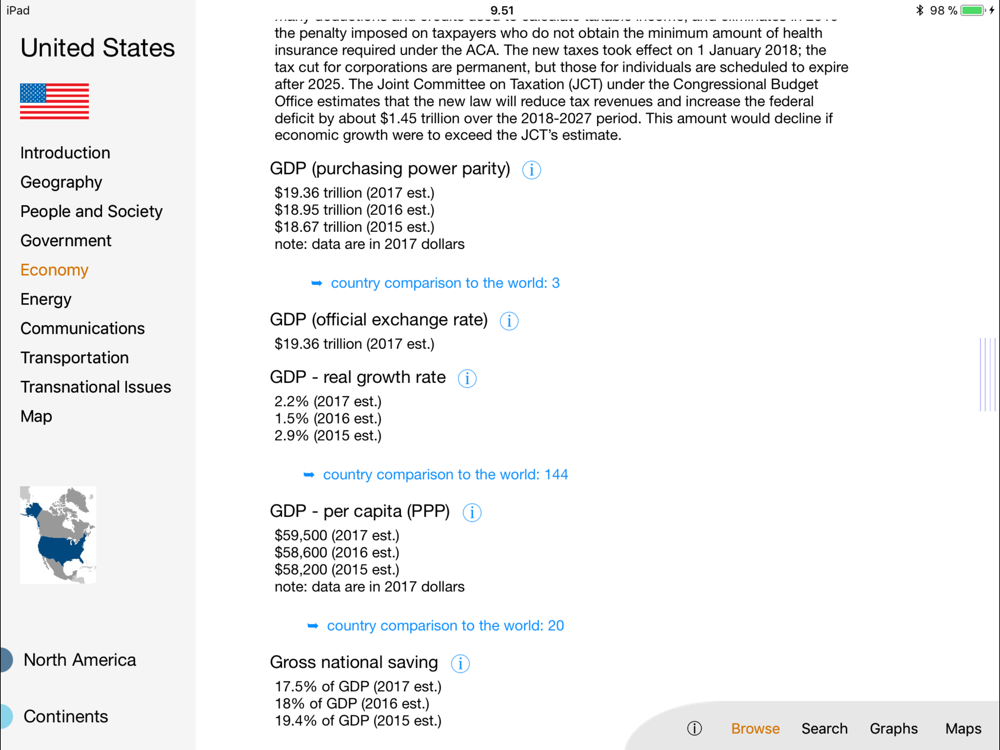 The World Factbook Visual Edition has information on the people, society, government, economy, geography, communications, transportation, military, and transnational issues for 267 world entities. Information in this version of the app is up-to-date as of December 2018.