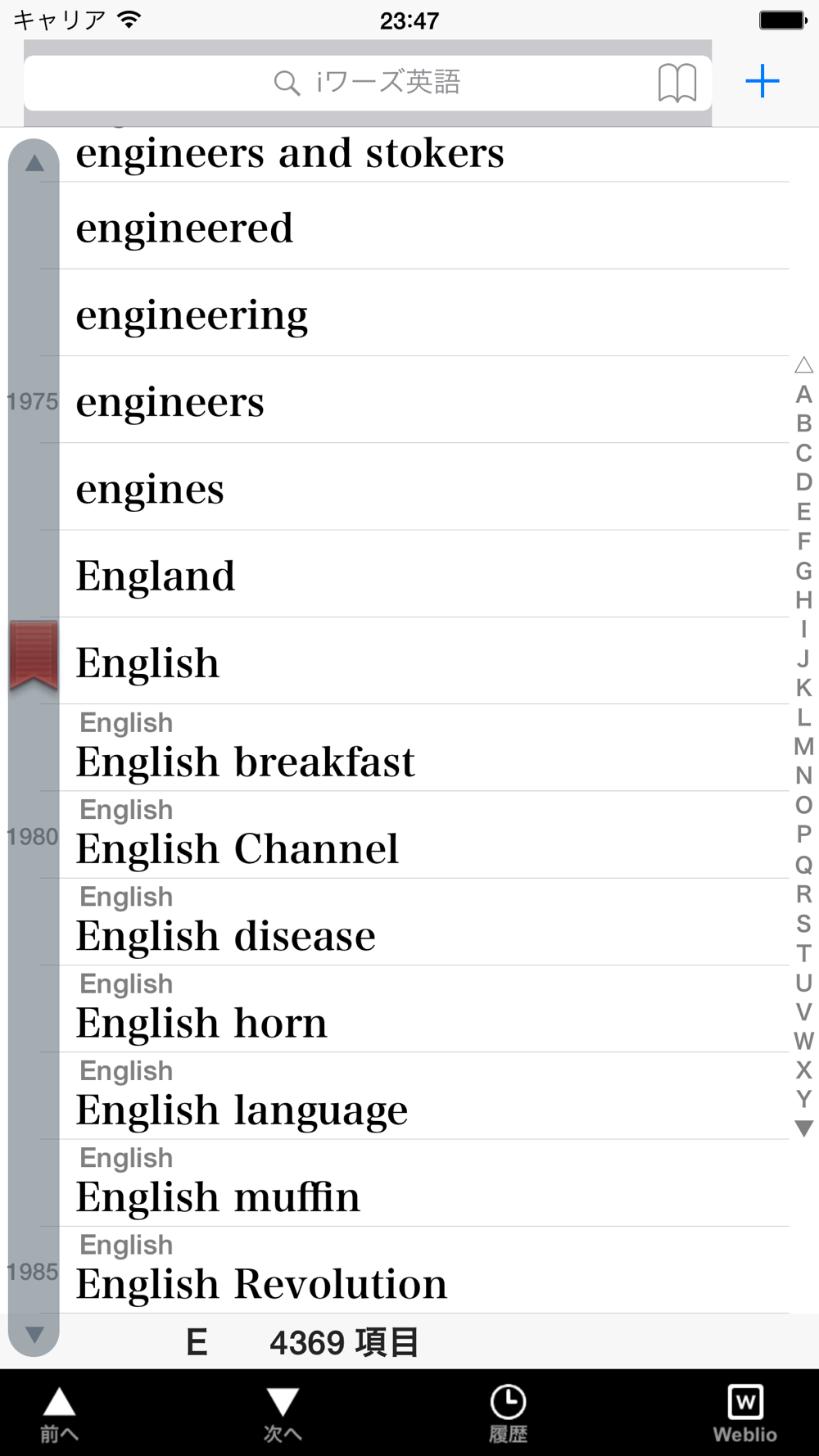 iワーズ英語 は「辞書をめくる」をコンセプトにしています。英和・和英中辞典に収録される言葉を中心とした「英語・日本語の言葉」18万項目をリスト表示し、言葉リストの両サイドに配置した「目次」と「スライダー」を駆使して、言葉の集まりに素早くアクセスすることができます。