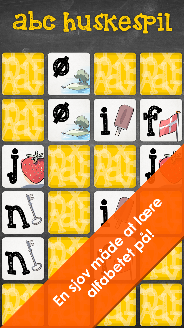 I “abc huskespil” lærer børn de små bogstaver i alfabetet. Spillet går ud på at finde ens kort og kan umiddelbart forståes og spilles af alle. Når et kort vendes læses bogstavet højt. På kortet er der samtidig et billede af noget barnet kender, som starter med det pågældende bogstav.