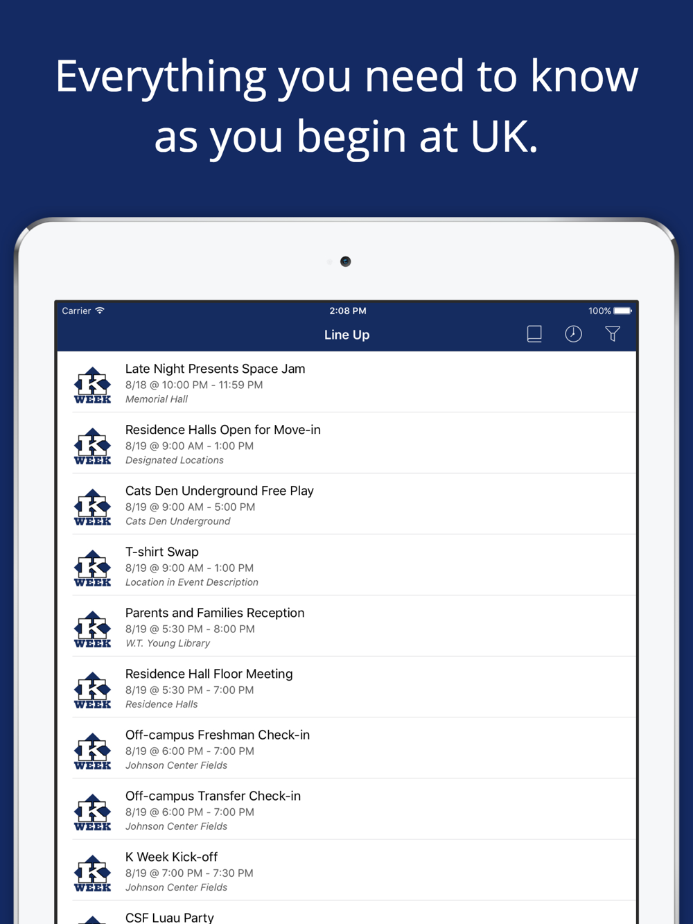 Welcome to the University of Kentucky! K Week, the fall welcome week for all new students, is designed to make the transition to UK and to college life as smooth as possible. K Week encompasses nine days with approximately 250 events, sessions, and social activities planned each one offering a unique and exciting experience.