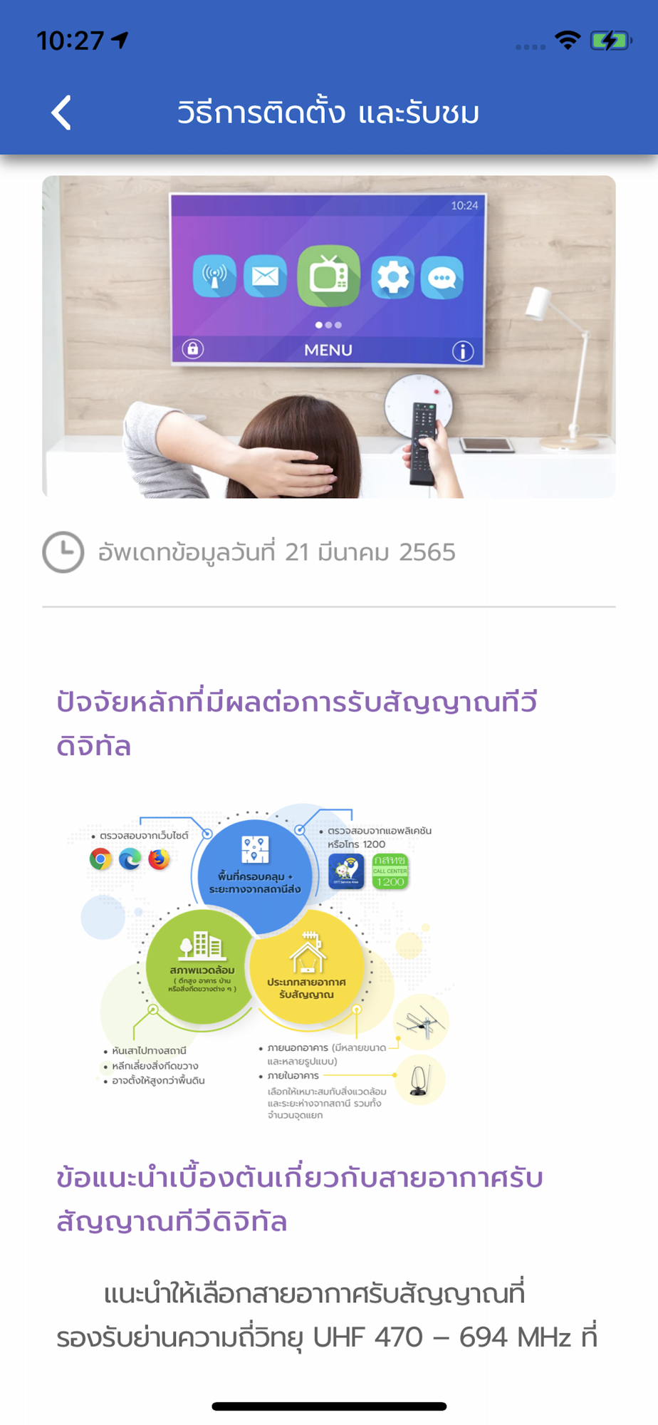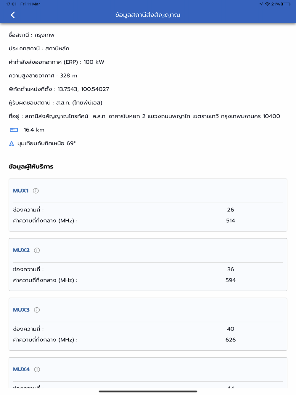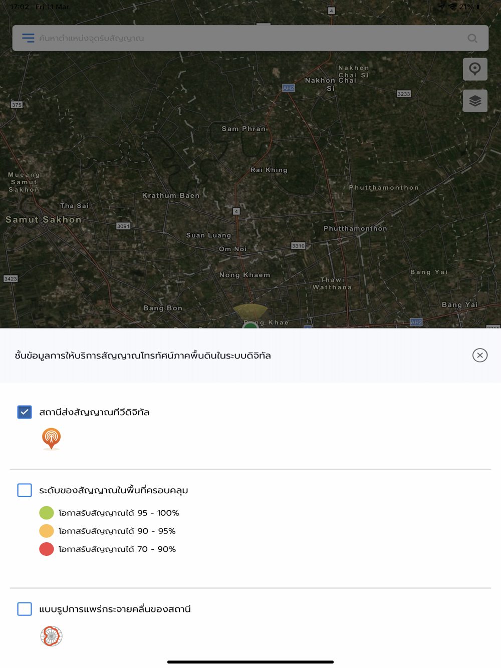 ระบบตรวจสอบพื้นที่ครอบคลุมสัญญาณโทรทัศน์ภาคพื้นดินในระบบดิจิทัล (Digital Terrestrial Television Service Area) โดย สำนักงานคณะกรรมการกิจการกระจายเสียง กิจการโทรทัศน์และกิจการโทรคมนาคม(สำนักงาน กสทช.) มีจุดประสงค์เพื่อช่วยเหลือประชาชนในการหาทิศทางในการรับสัญญาณโทรทัศน์ดิจิทัล โดยอาศัยแบบจำลองการแพร่กระจายคลื่นประกอบกับข้อมูลทางเทคนิคของผู้ให้บริการโครงข่ายเฉพาะในส่วนของสถานีหลัก และอาศัยข้อมูลภูมิประเทศในการคำนวณ ทั้งนี้ ข้อมูลทั้งหมดเป็นการวิเคราะห์จากซอฟแวร์ซึ่งเป็นการคาดการณ์ และขอสงวนความรับผิดที่อาจเกิดขึ้น ไม่ว่าทางตรงหรือทางอ้อม อันเกิดมาจากการนำข้อมูลนี้ไปใช้ทุกกรณี สำนักงาน กสทช. จะไม่รับผิดสำหรับความเสียหายใดๆ