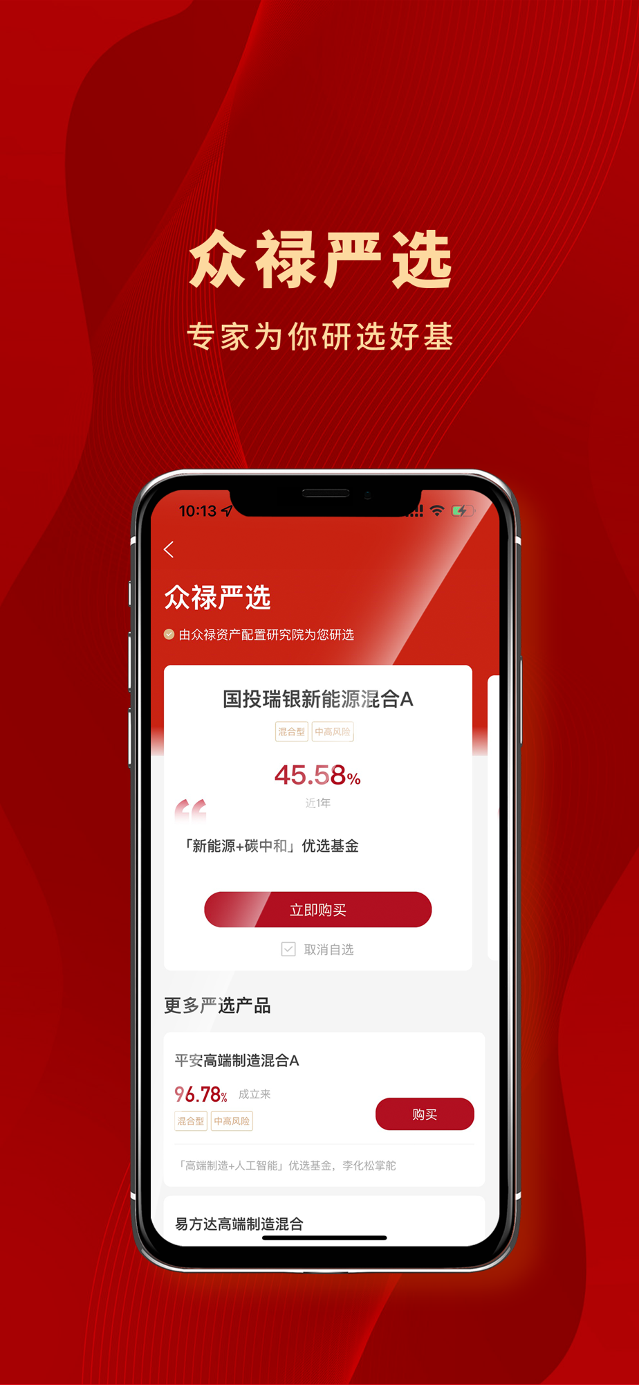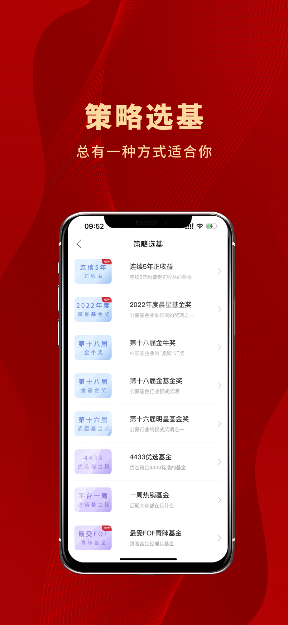 众禄严选、策略选基、投顾组合等多种特色功能/服务,满足不同人群的投资需求,让您轻松告别选基困难症。