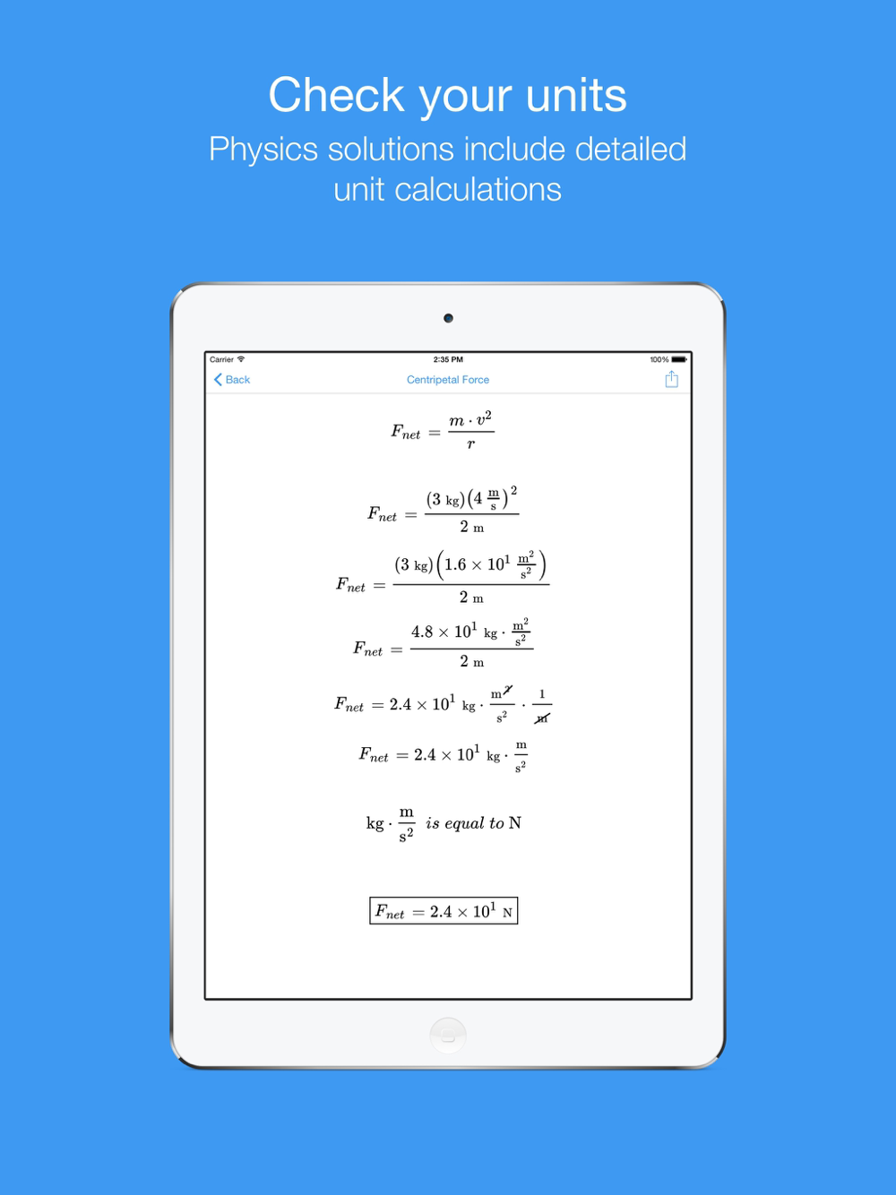 • Physics solutions include all unit calculations and can be displayed in either decimal or scientific notation