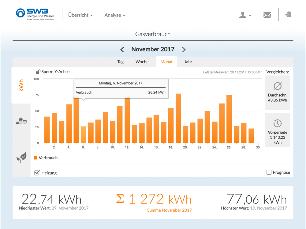 • Übersichtliche Analyseseiten mit verschiedenen Vergleichsmöglichkeiten für jeden Zähler