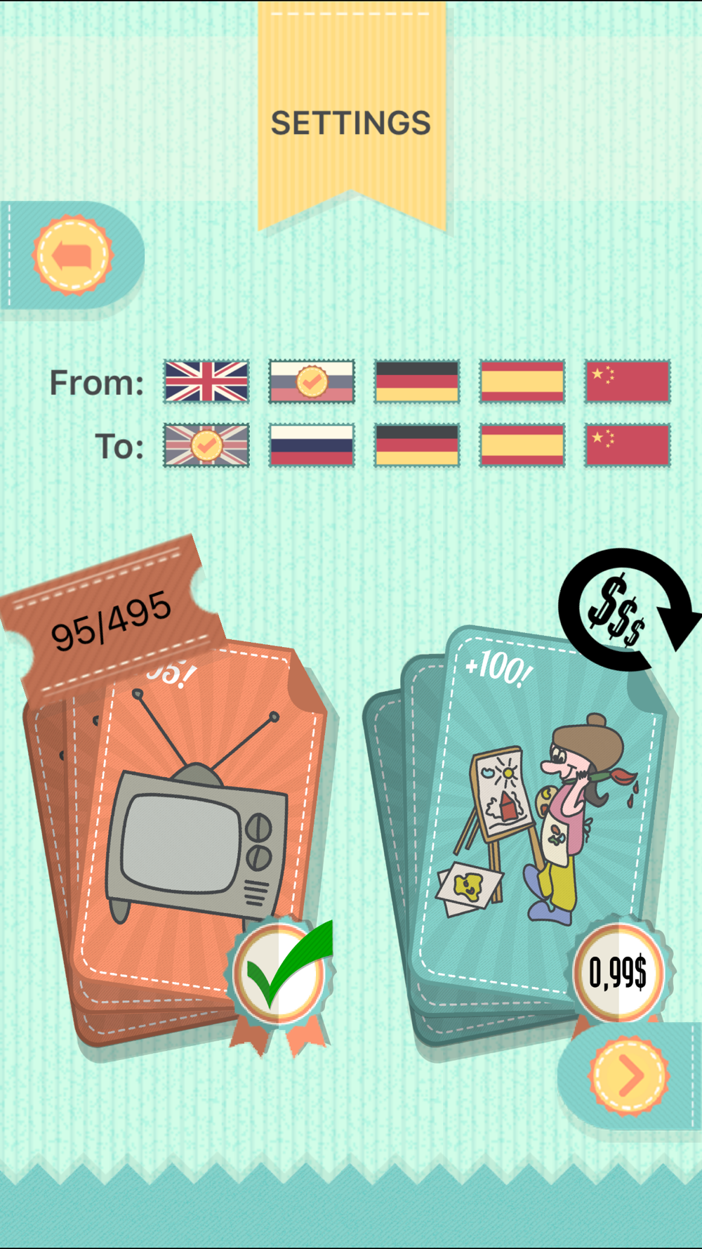 Did you know that the average vocabulary allowing for standard communication with native speakers is comprised of around 300-500 words? Did you also know that people who are fluent in a foreign language rarely use more than 1,000 words in everyday speech? This app will give you the unique opportunity to learn in the form of play 500 words in 4 of the most widely spoken foreign languages in the world. You can learn words by hearing them or by seeing them written. Each word is supplemented by an image hint enabling you to visually memorize the word. This way even children who have just learned to read in their native language can learn foreign language words. Expand your linguistic horizons with our app!