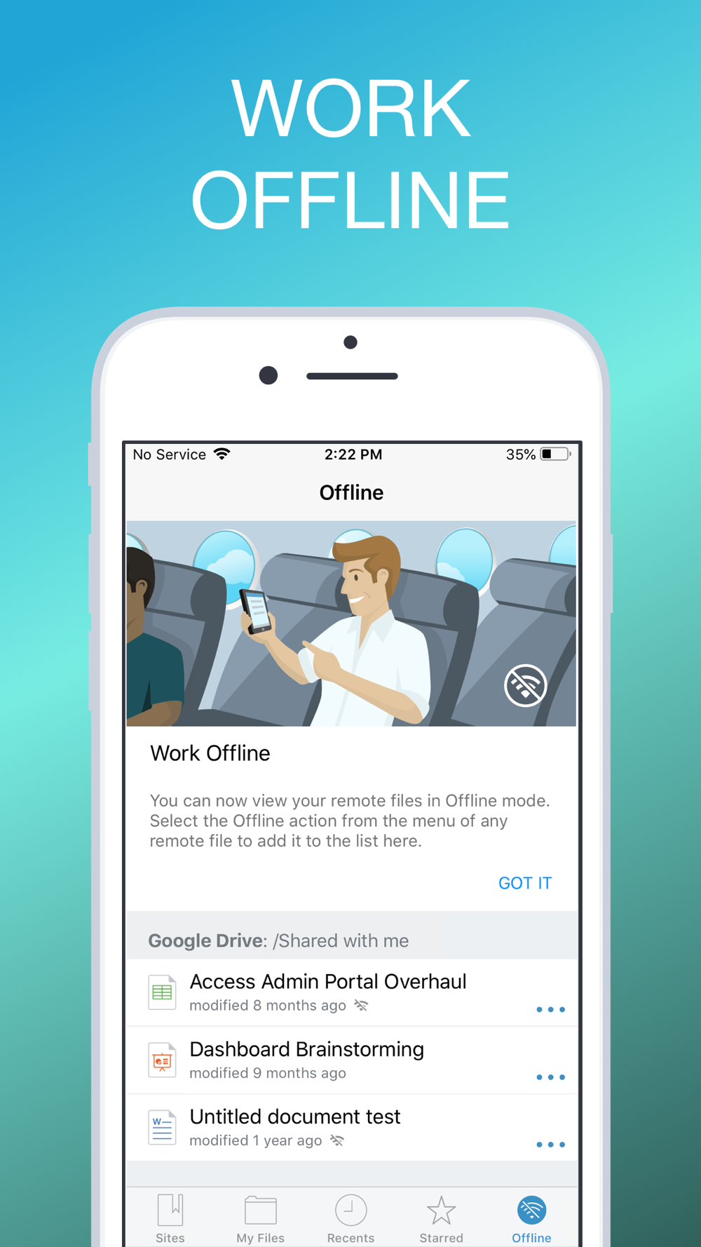 MobileIron Docs@Work allows you to easily find and securely access the documents, presentations and files your company uses the most. With Docs@Work, mobile users have an intuitive way to access, annotate, share, and view business documents from email, SharePoint, network drives and a variety of other content management systems including popular cloud services like Box , Dropbox and Google Drive. Connect to your important business files while on the go with MobileIron Docs@Work.