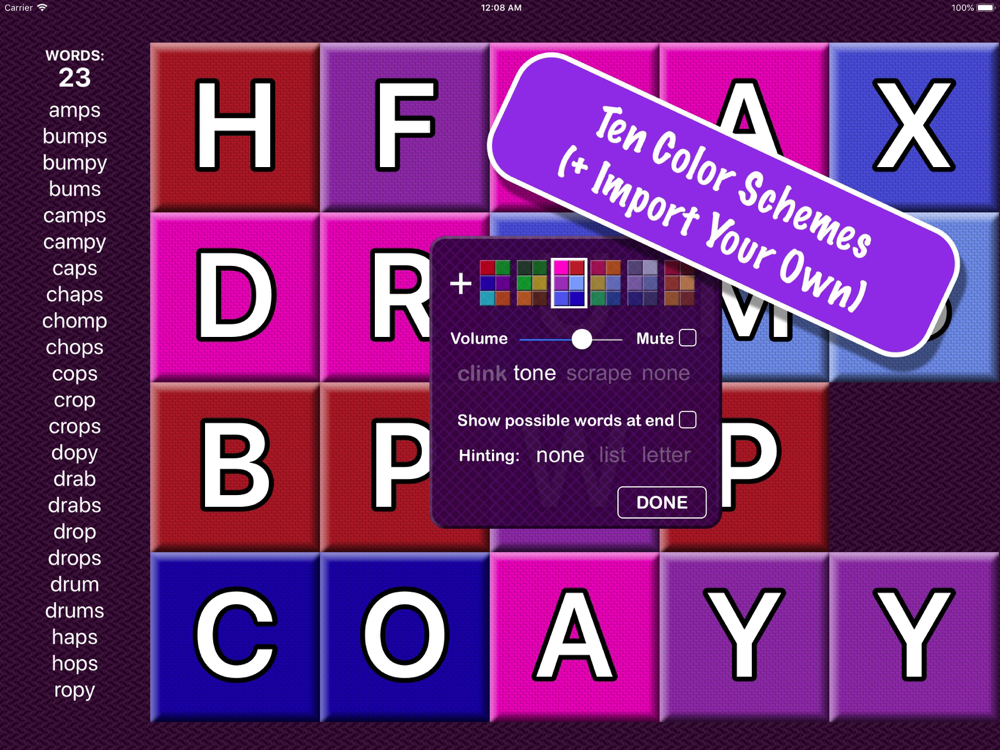 Multiple game variations are provided, based on the length of the words that must be found and the game duration. You may also play in an un-timed mode where you can look for words as long as you want. Several different color schemes are provided for variety, and you can even create and import your own color schemes using the Pattern Artist app (or Pattern Artist Free).