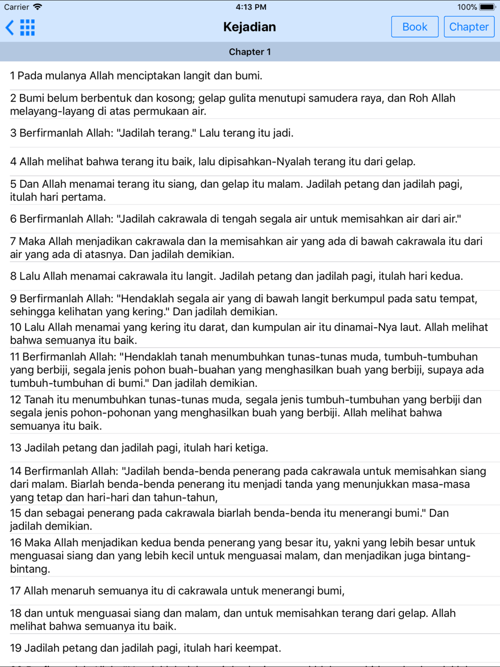 We are proud and happy to release Indonesian Alkitab in iOS . This app contains both "Old Testament" and "New Testament" in Indonesian. This is our first effort in bringing you Bible in Indonesian. We have included several features such as Bookmark,Facebook,Twitter,Email, Search for a verse, Jump to another chapter from one chapter, jump to another book from one book, share the content on Facebook, Twitter, send the selected verse through SMS, etc. We sincerely hope that this app will rejoice you.