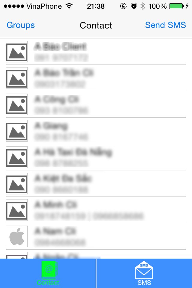 - Contact: here you can create a group, delete the group, add contacts to the group or remove contact from the group. You can view a list of contacts in the group you choose. You can choose the contact to send the sms.