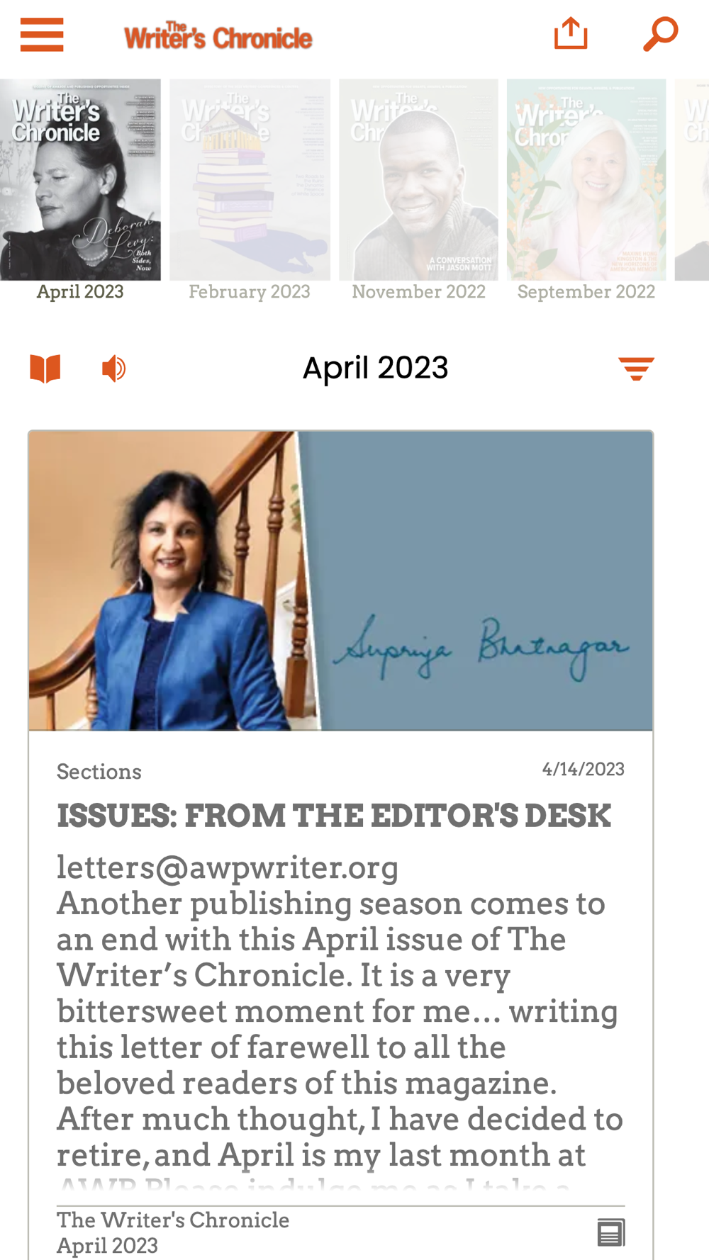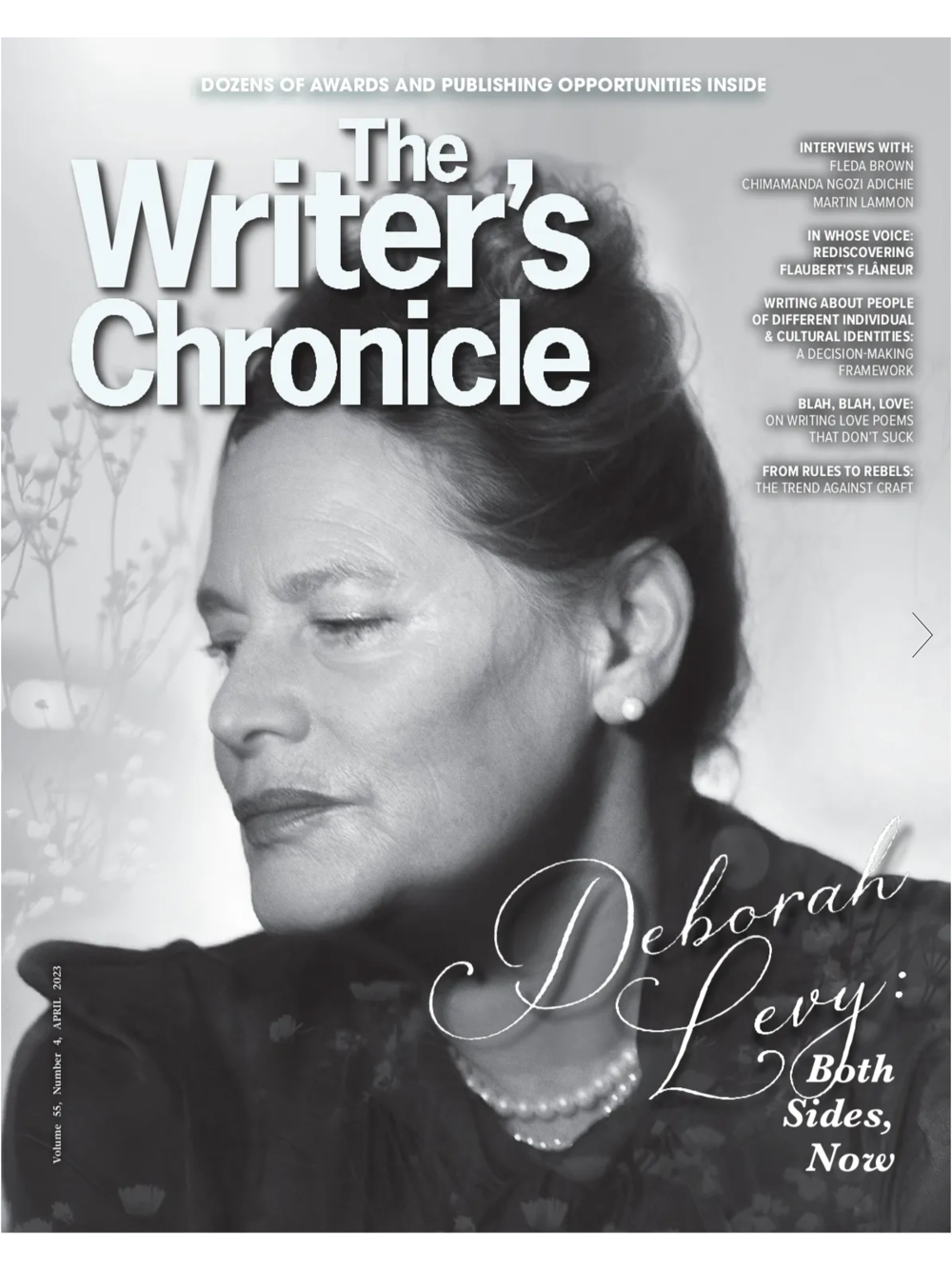 The Writer's Chronicle provides community, information, news, and ideas for writers. The Writer's Chronicle is published by the Association of Writers & Writing Programs (AWP), a nonprofit arts organization. Each issue of the Chronicle also features news on the national literary scene, including listings of opportunities for grants, awards, and publication.