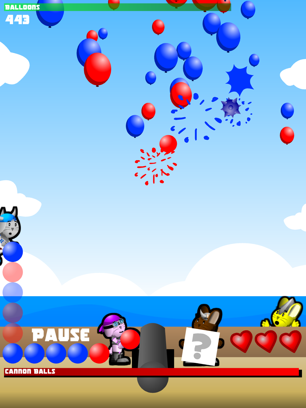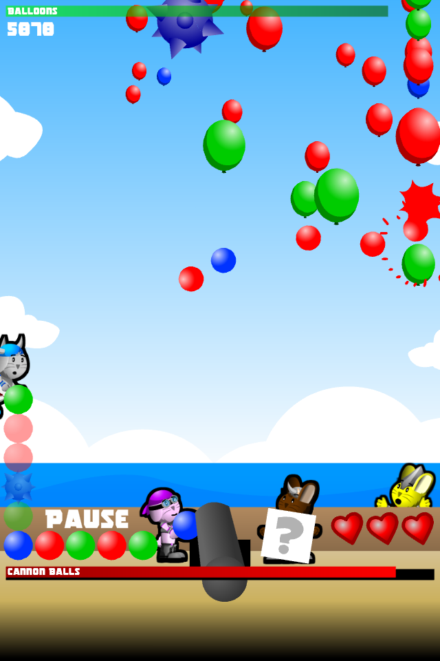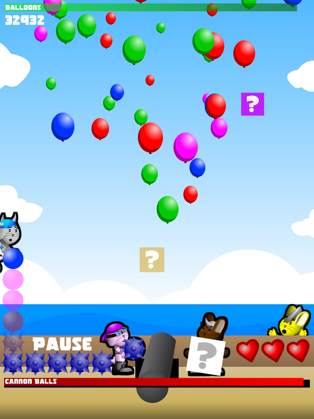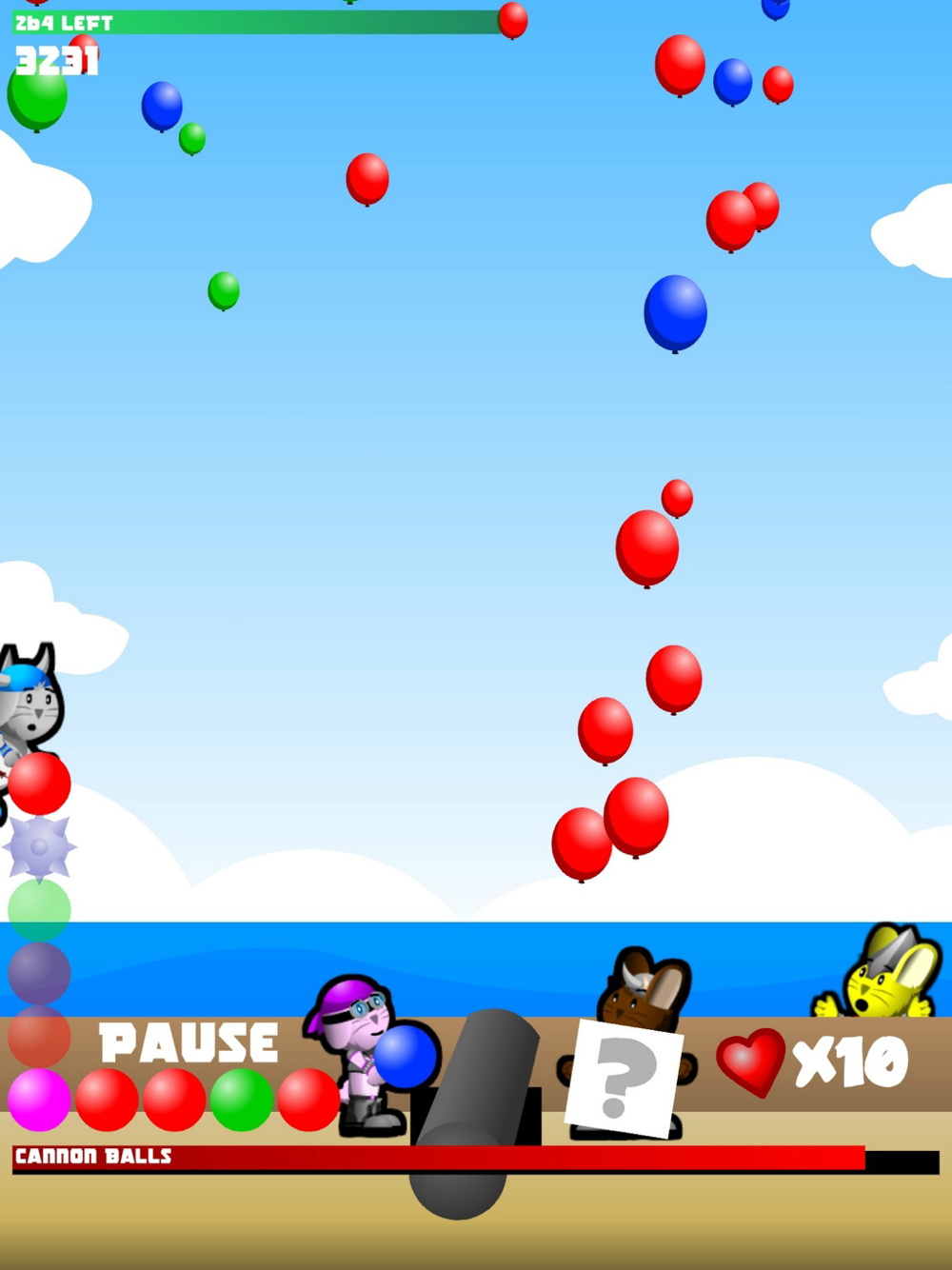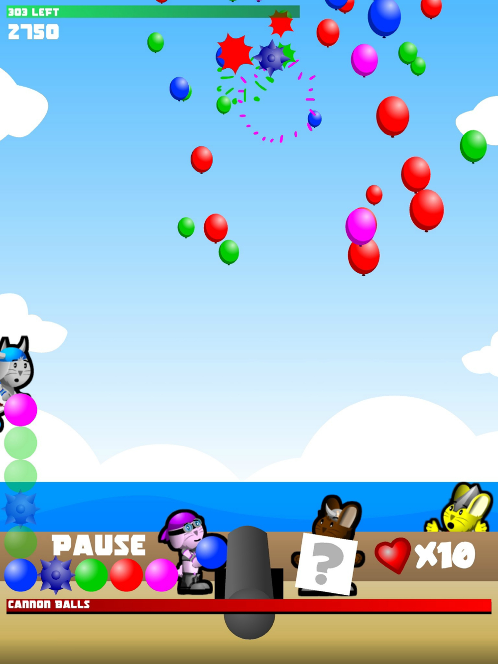 The Viking Bunnies are back and this time they are ready to pop an armada of balloons for great prizes! (Apparenty Captain Fuzzy believes these balloons to be monsters ... so just go with it.) Using their trusty cannon aboard The Bunny Ship, blast the balloons overhead as they come your way with an array of colorful cannonballs. Just don't let the balloons (as well as dynomite, fireballs, and spike balloons) damage The Bunny Ship because nobody wants that. How many balloons can you pop? Is there gold in those balloons?
