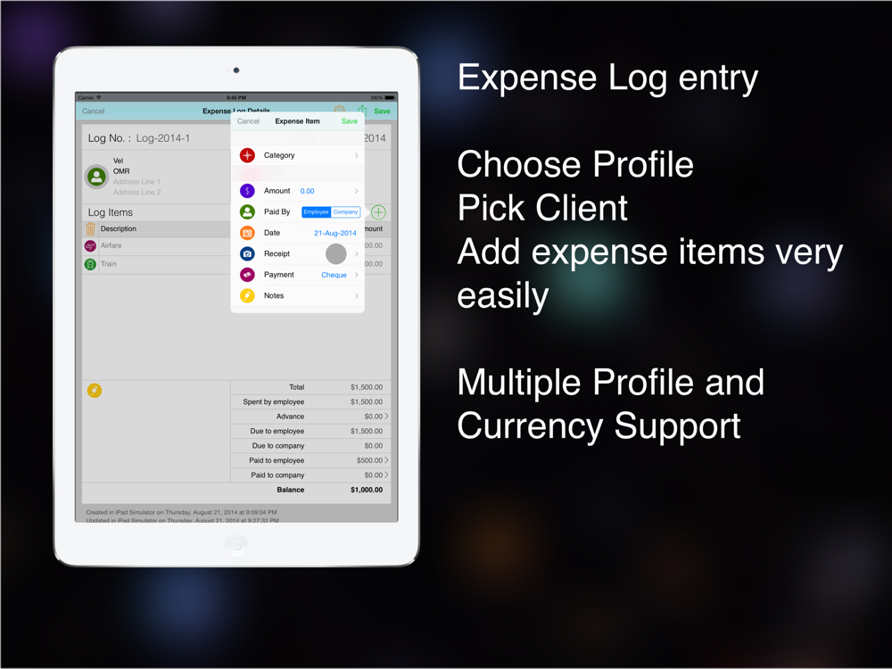 Business Travel Expense Tracker app is to track business travel expenses like airfare, lodging, dining, registration fees, etc., Log expenses, create and send pdf invoices.