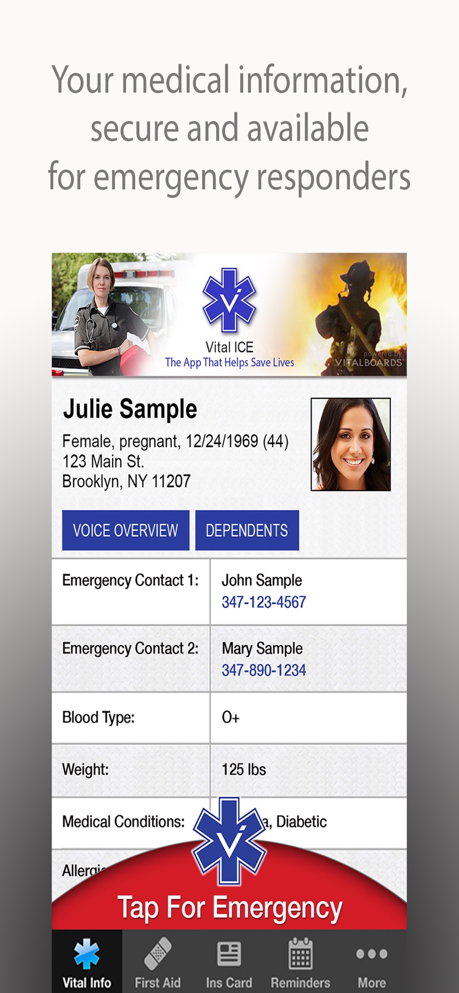 EMS and First Responders play a critical role in any life-threatening emergency situation. Any medical information for the patient that can be provided to them upon their arrival increases the odds of a more favorable outcome. Time saves lives, and Vital ICE saves time.
